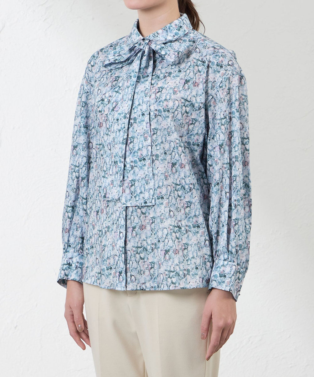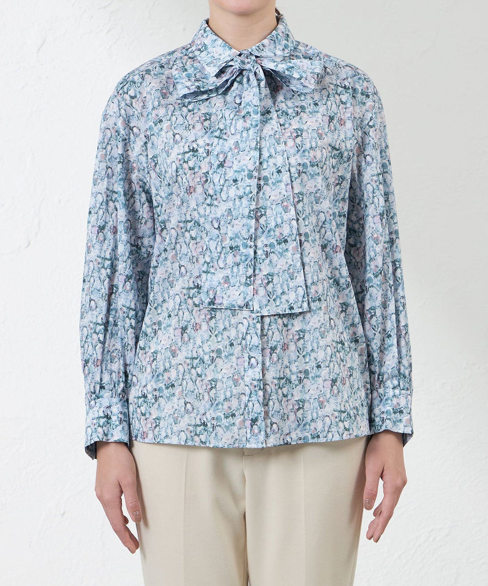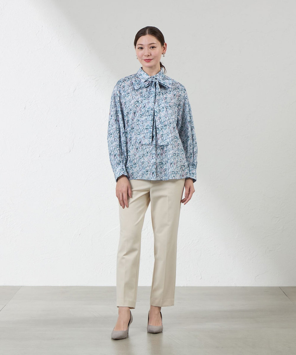 ボリューム感のあるボウタイが華やかな印象のブラウス。襟ぐりと袖口にはギャザーを入れ、ふんわりとエレガントなシルエットに。
