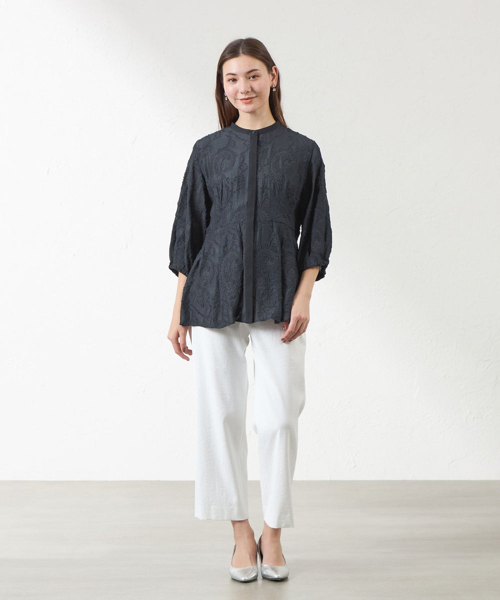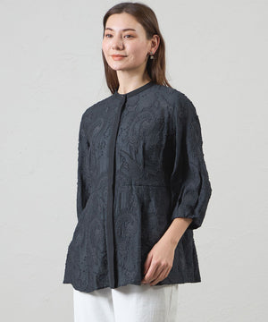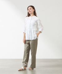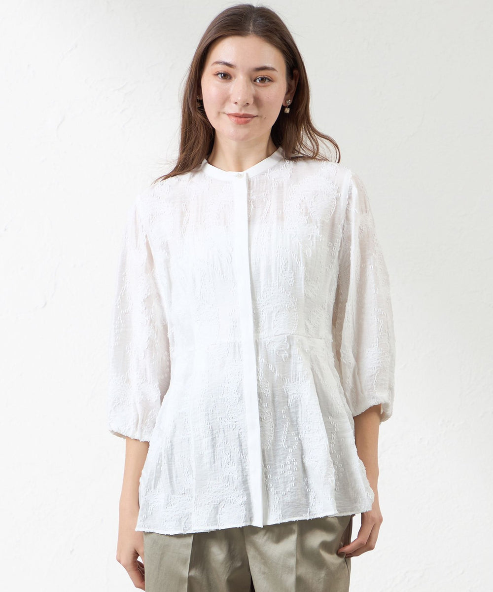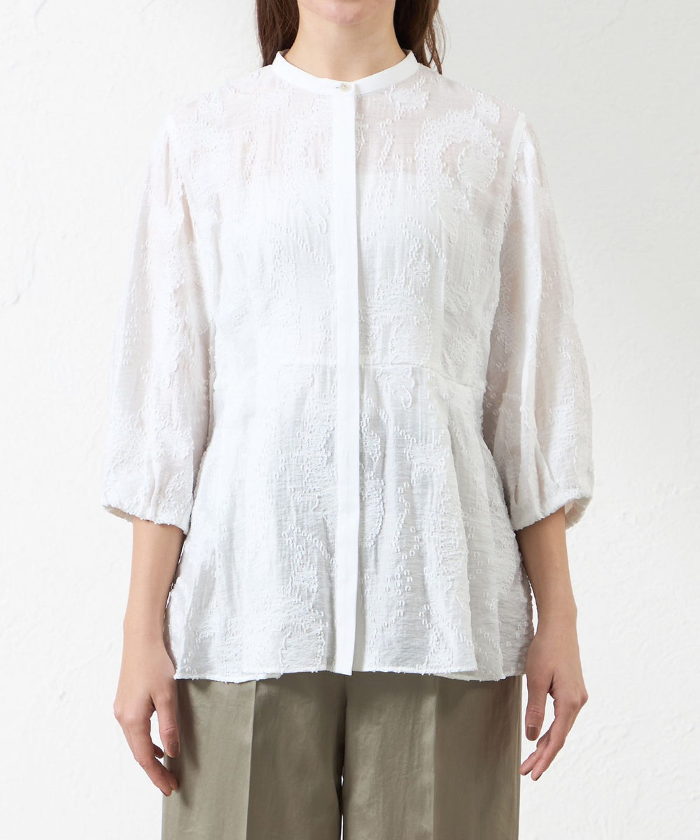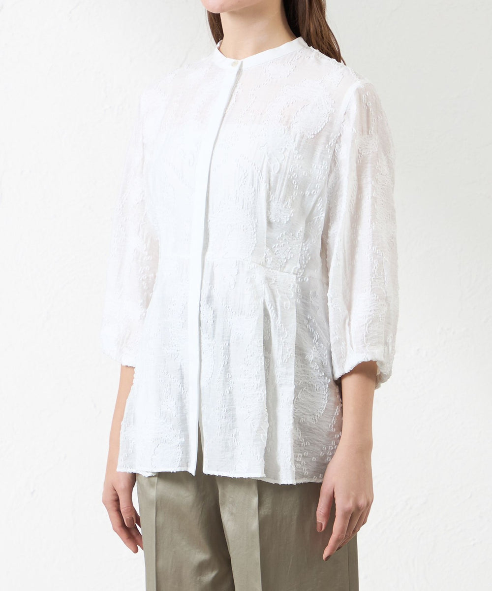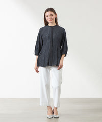 細めのスタンドカラーと前立てに100/2コットンタイプライターを使用したチュニック丈のブラウスです。