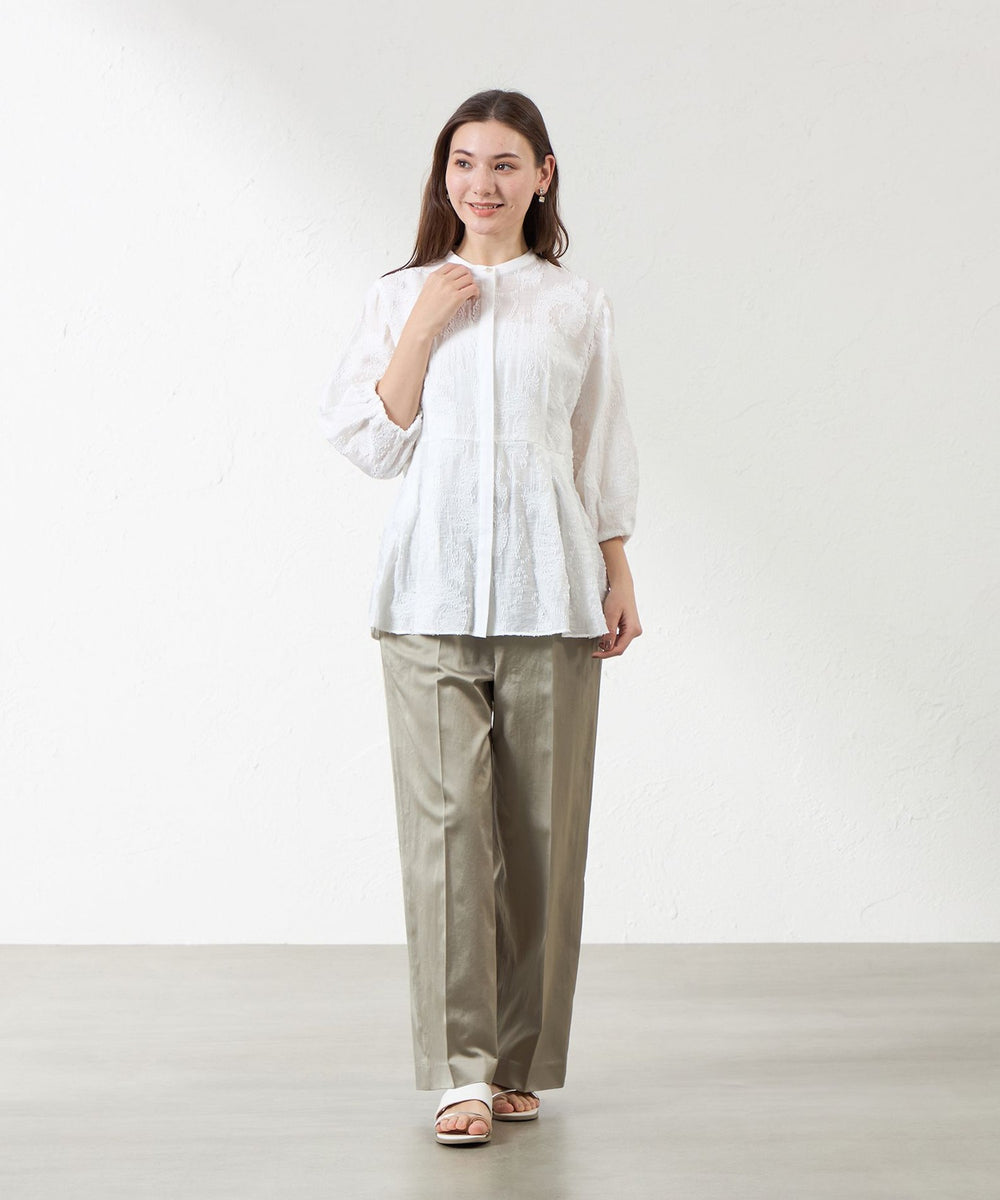 ウエストからタックが入ったデザインで着やせ効果が期待でき、裾に向けて広がるシルエットがパンツに合うデザインです。
