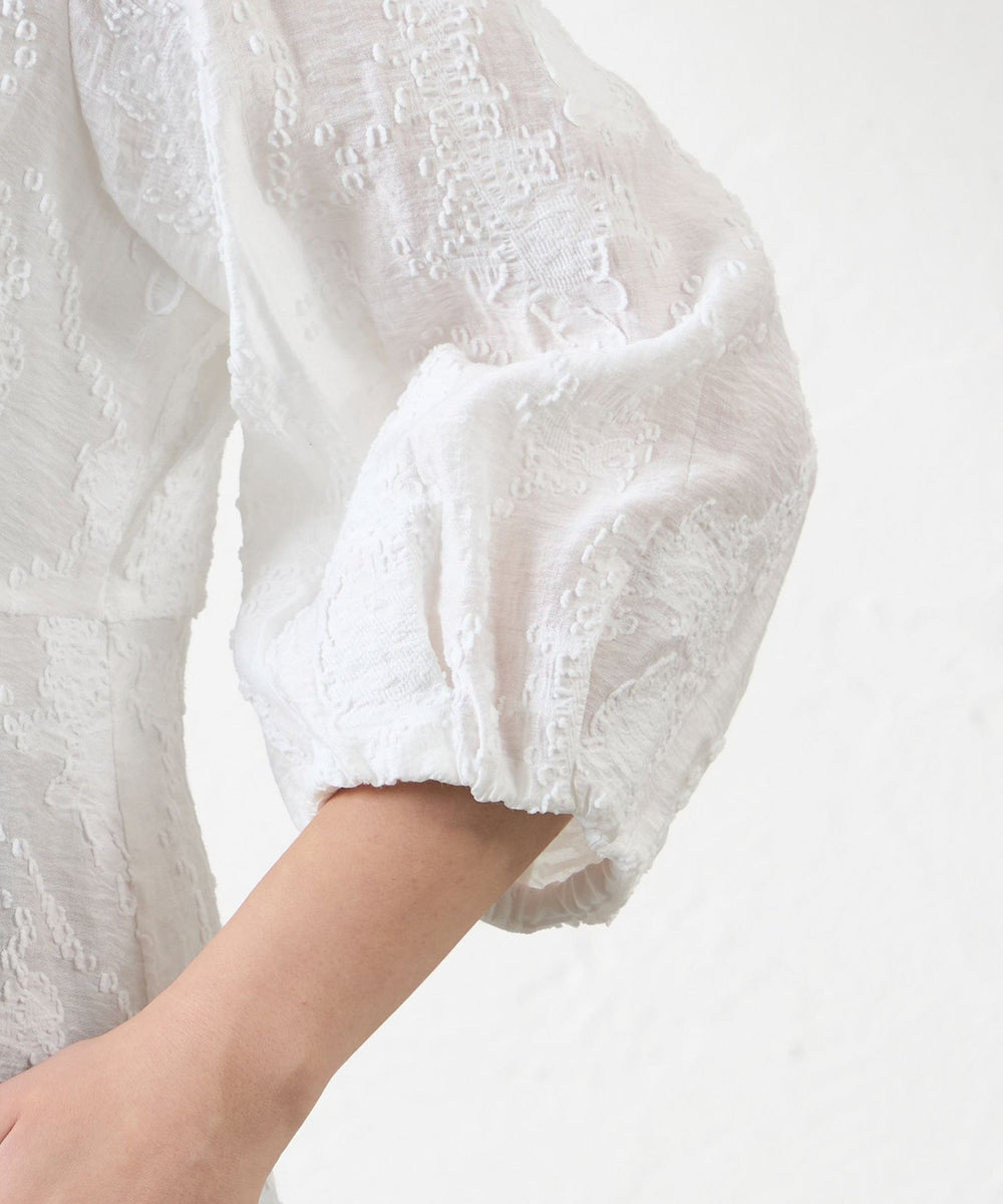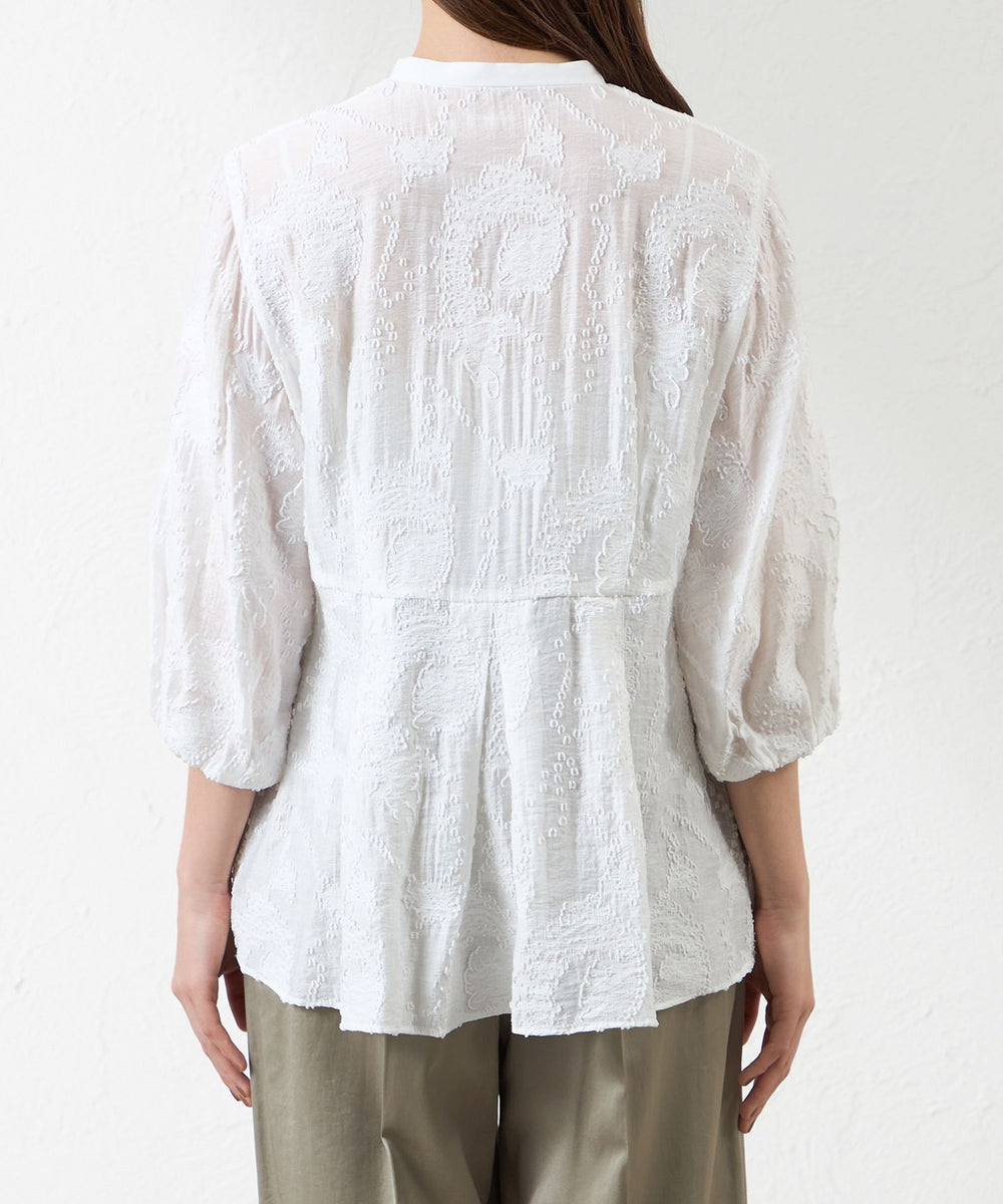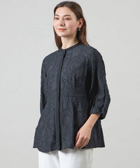 表情感豊かなカットジャガードの素材です。薄地で軽く、柄行きも素敵なので一枚で主役級のブラウスが出来ました。