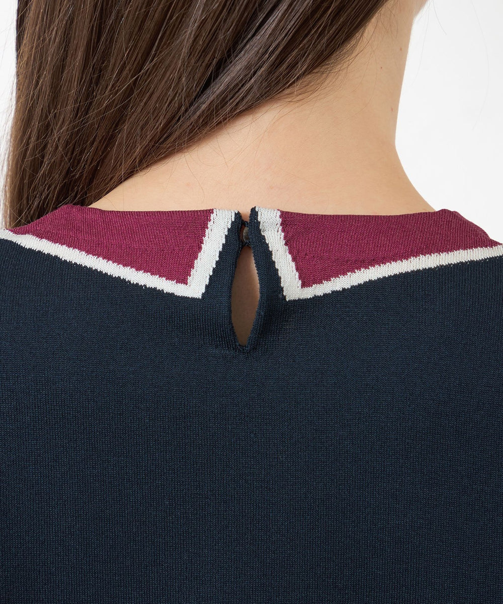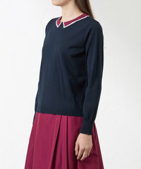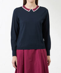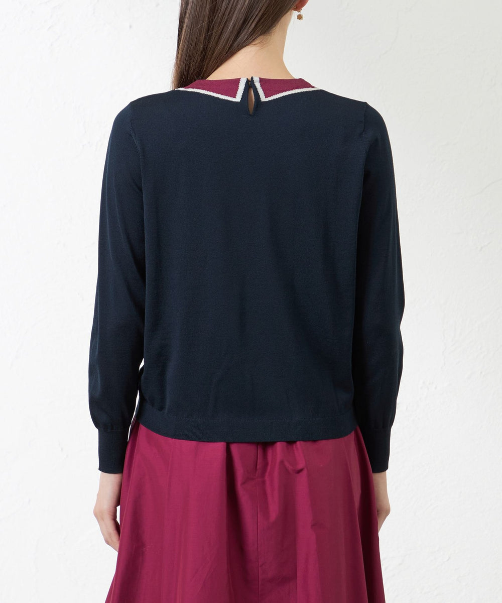 配色の襟をインターシャで編込んだトロンプルイユのプルオーバーです。