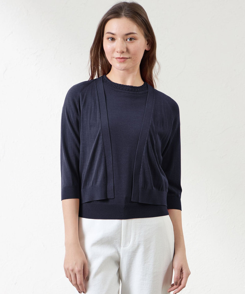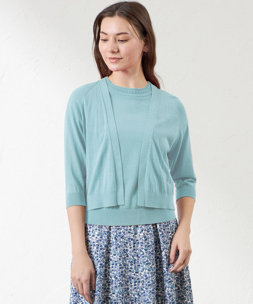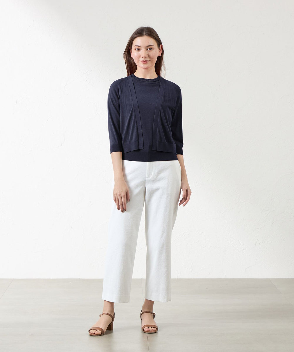 細番手の綿とレーヨンを撚糸し、さらに追撚することにより目面がきれいでハリコシのあるさらっとした風合いが特長の素材です。接触冷感機能付きで手洗い可能な素材のため、お手入れしやすく暑いシーズンにもピッタリなアンサンブルです。