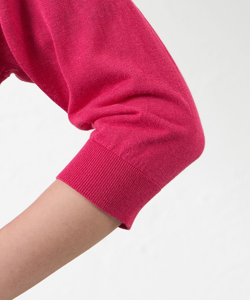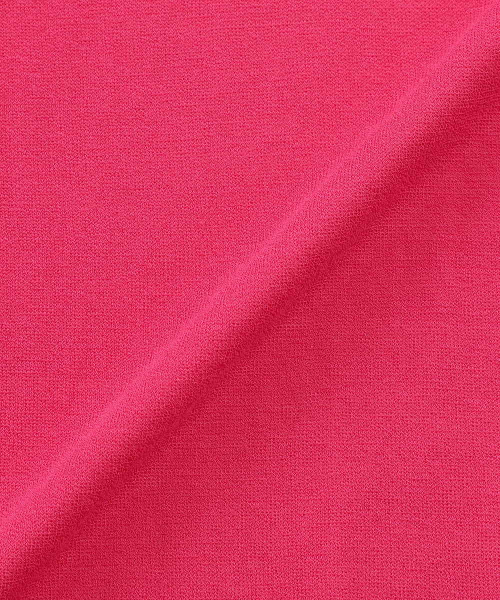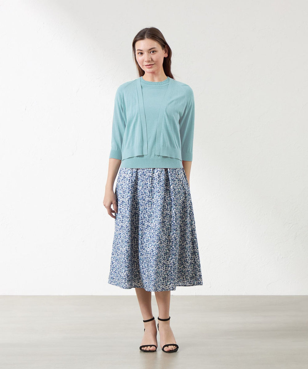 細番手の綿とレーヨンを撚糸し、さらに追撚することにより目面がきれいでハリコシのあるさらっとした風合いが特長の素材です。接触冷感機能付きで手洗い可能な素材のため、お手入れしやすく暑いシーズンにもピッタリなアンサンブルです。