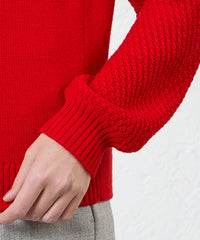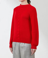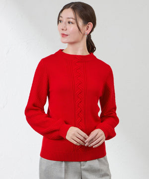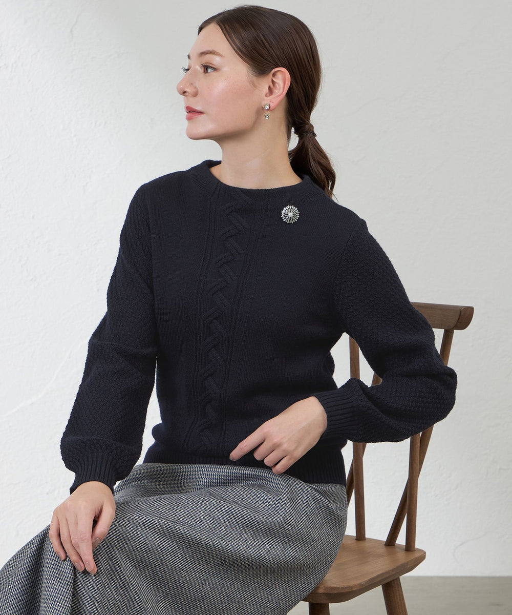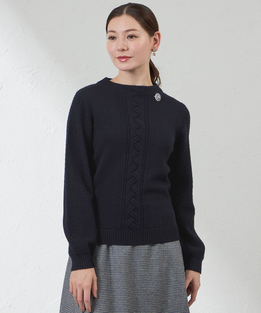 ケーブル柄を入れたボクシーなシルエットとボトルネックが特徴のニットプルオーバー。