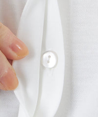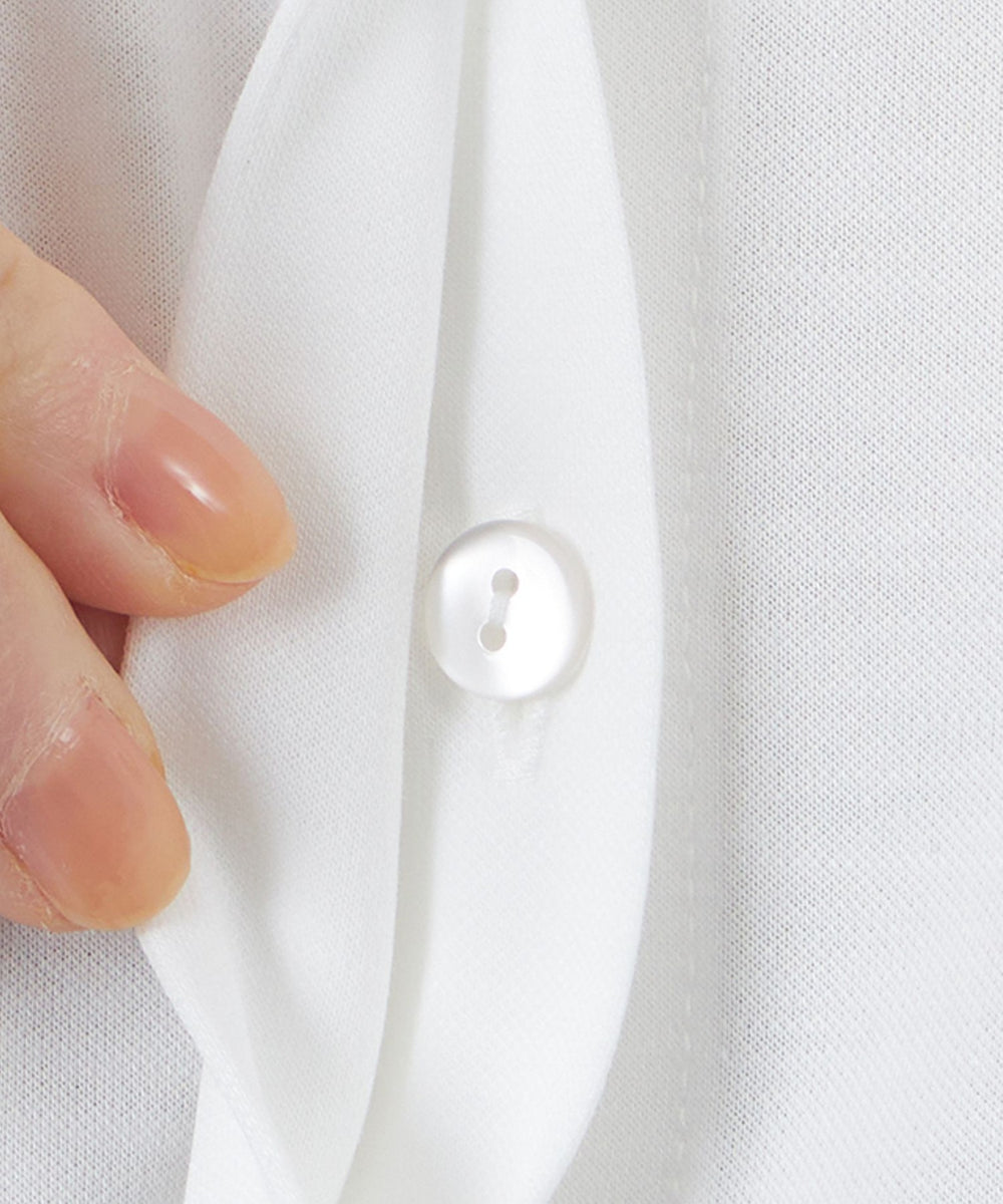 オリジナルのアクアツイスト糸を綿40番手と組み合わせ、AMACAらしい天然ライクと機能性を両立させる機能素材をオリジナル開発しました。ブラウスの良いところ(=きちんと感)とカットソーの良いところ(着心地、お手入れのしやすさ)を併せ持ったハイブリット素材です。