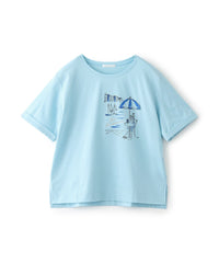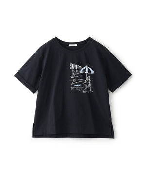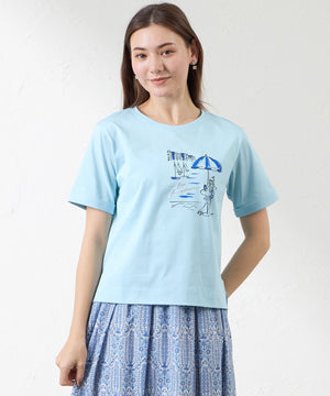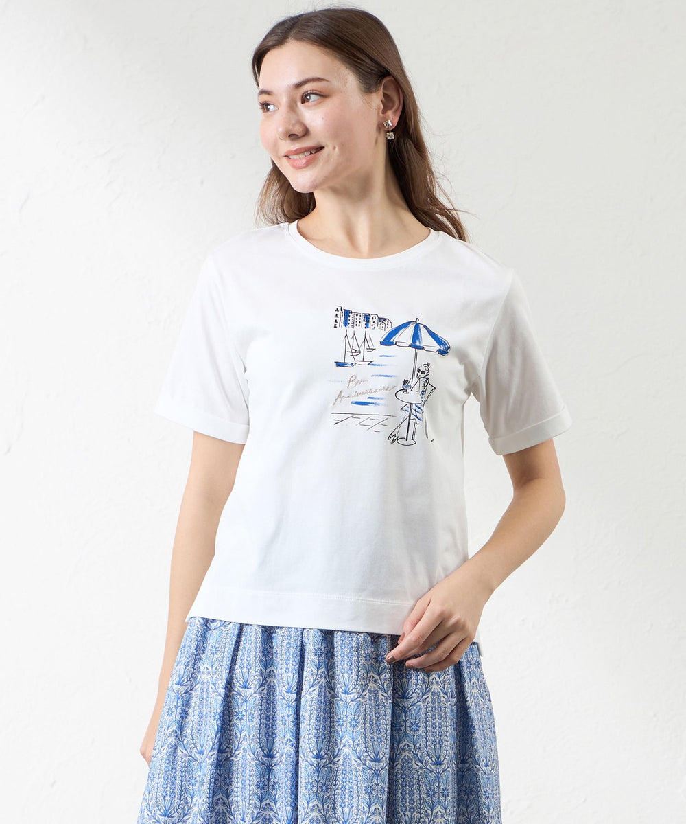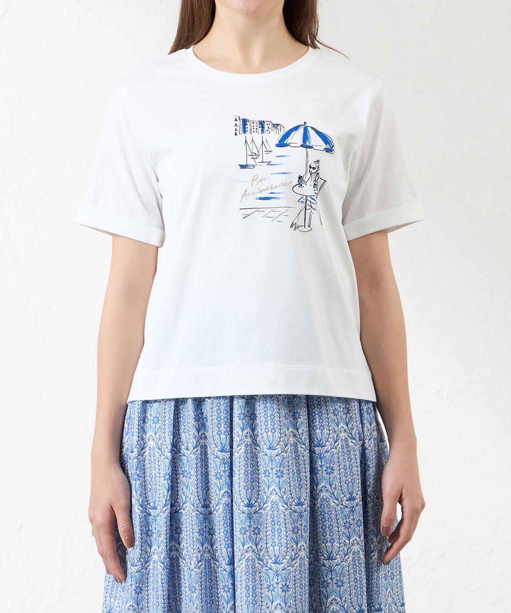 南フランスの海辺でパラソルの下、飲み物を飲む女の子。文字が刺繍でブルーの飲み物をグリッタープリントでで表現し、かわいらしく夏らしいプリントに仕上がりました。おとなの女性が安心していただけるサイズ感、素材感、デザインとなっております。