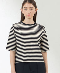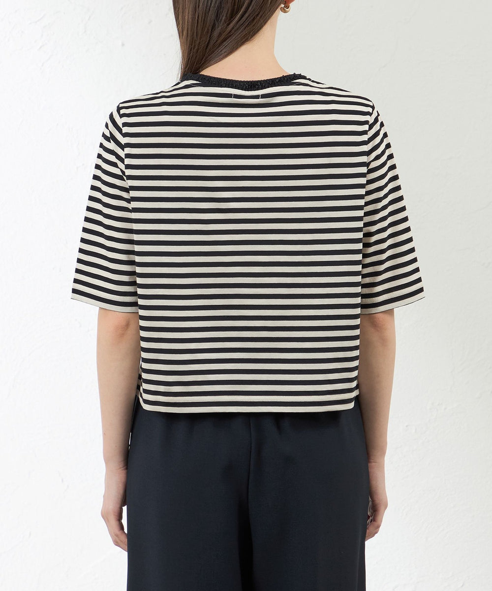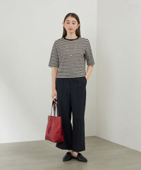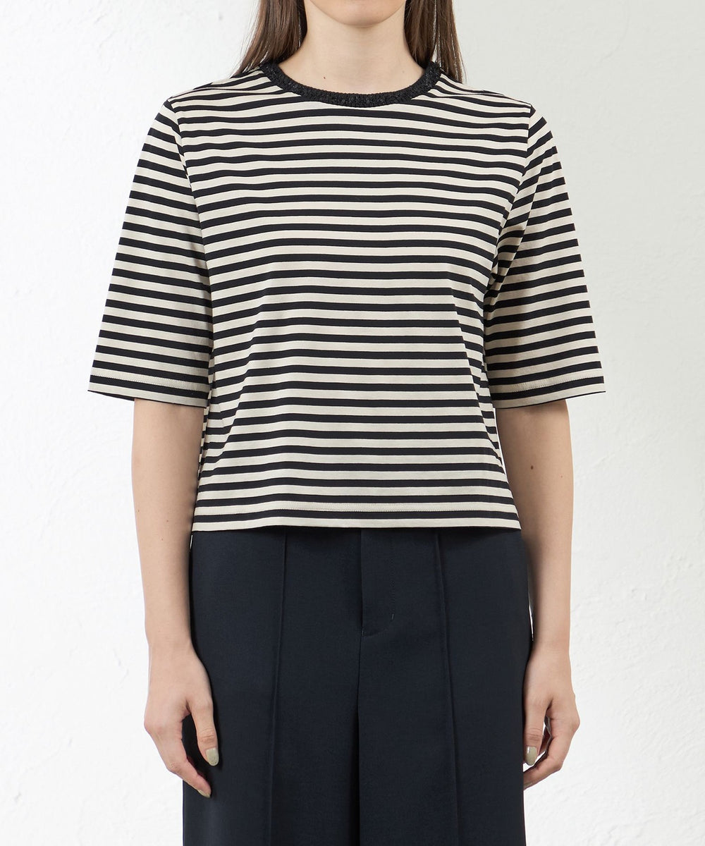 ボーダーなのにカジュアルになりすぎず、首元のアクセントで一気にエレガントに着映えします。