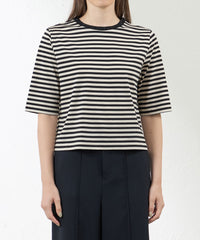 50Sの糸を使用したハイゲージ天竺です。先染めのボーダーを使用し、表面感のある大人ボーダーにしました。