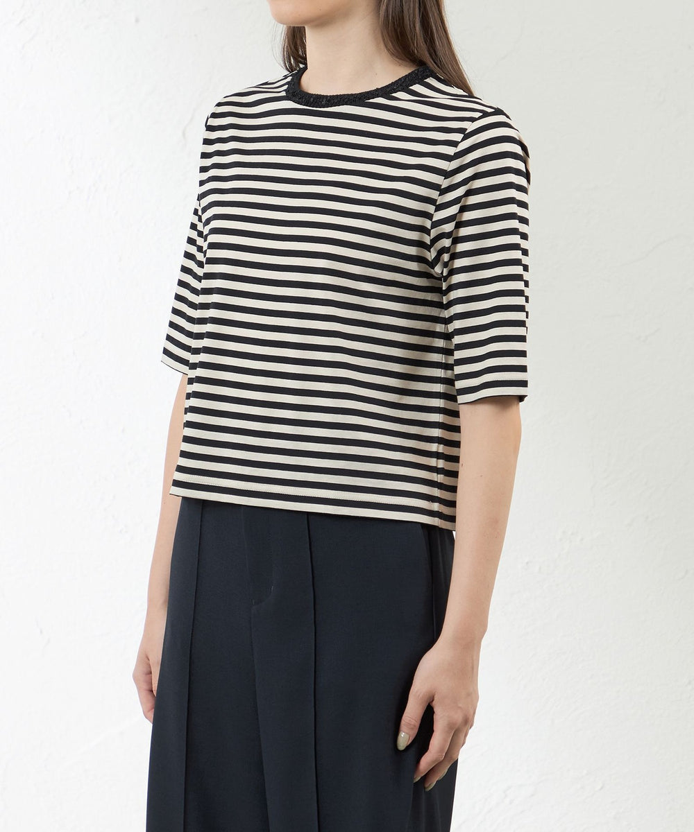 衿ぐりにニット付属をあしらったTシャツです。衿フゾクはリボンヤーンを使ったリブで、大人が着られる上品ディティールがポイントです。