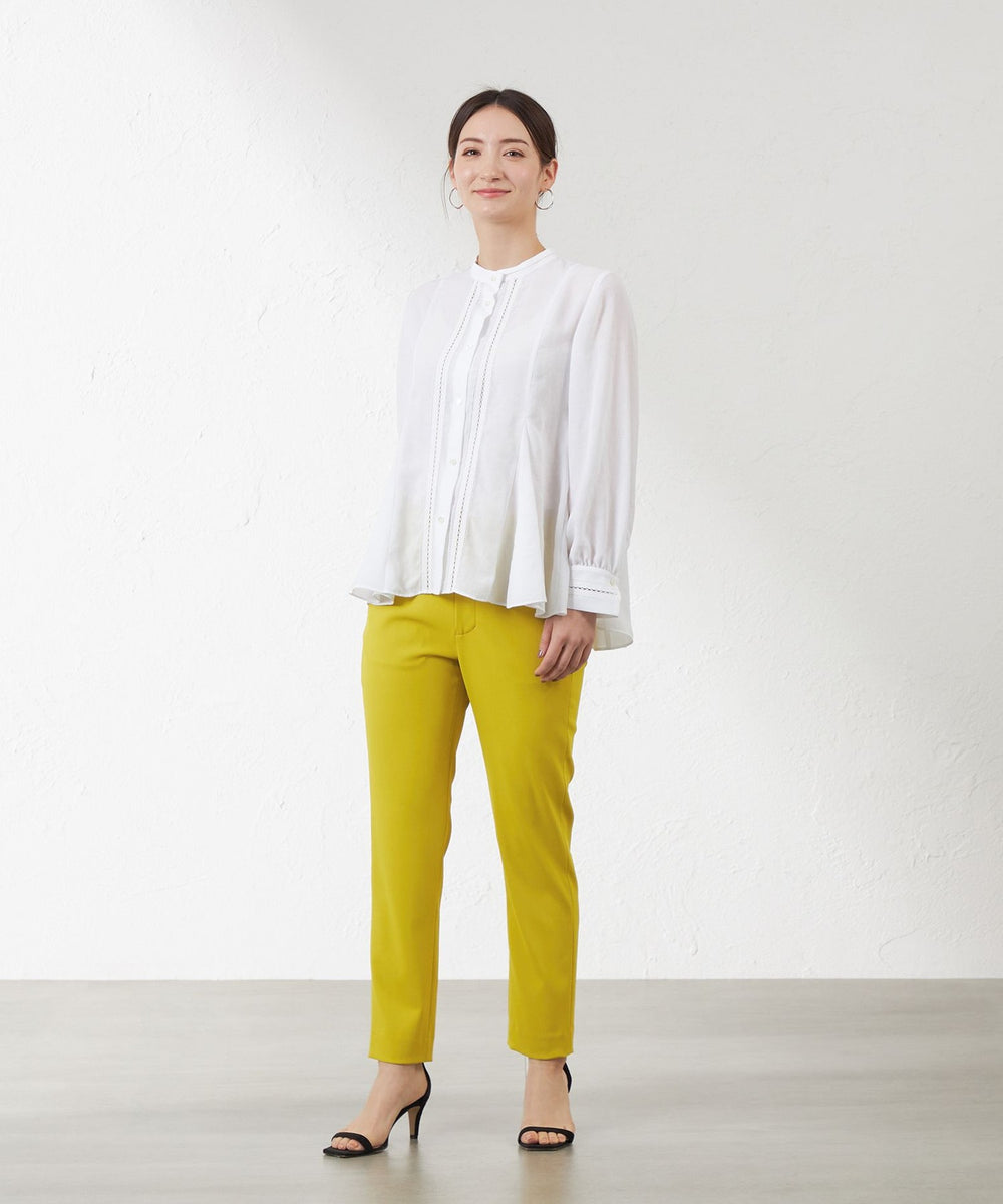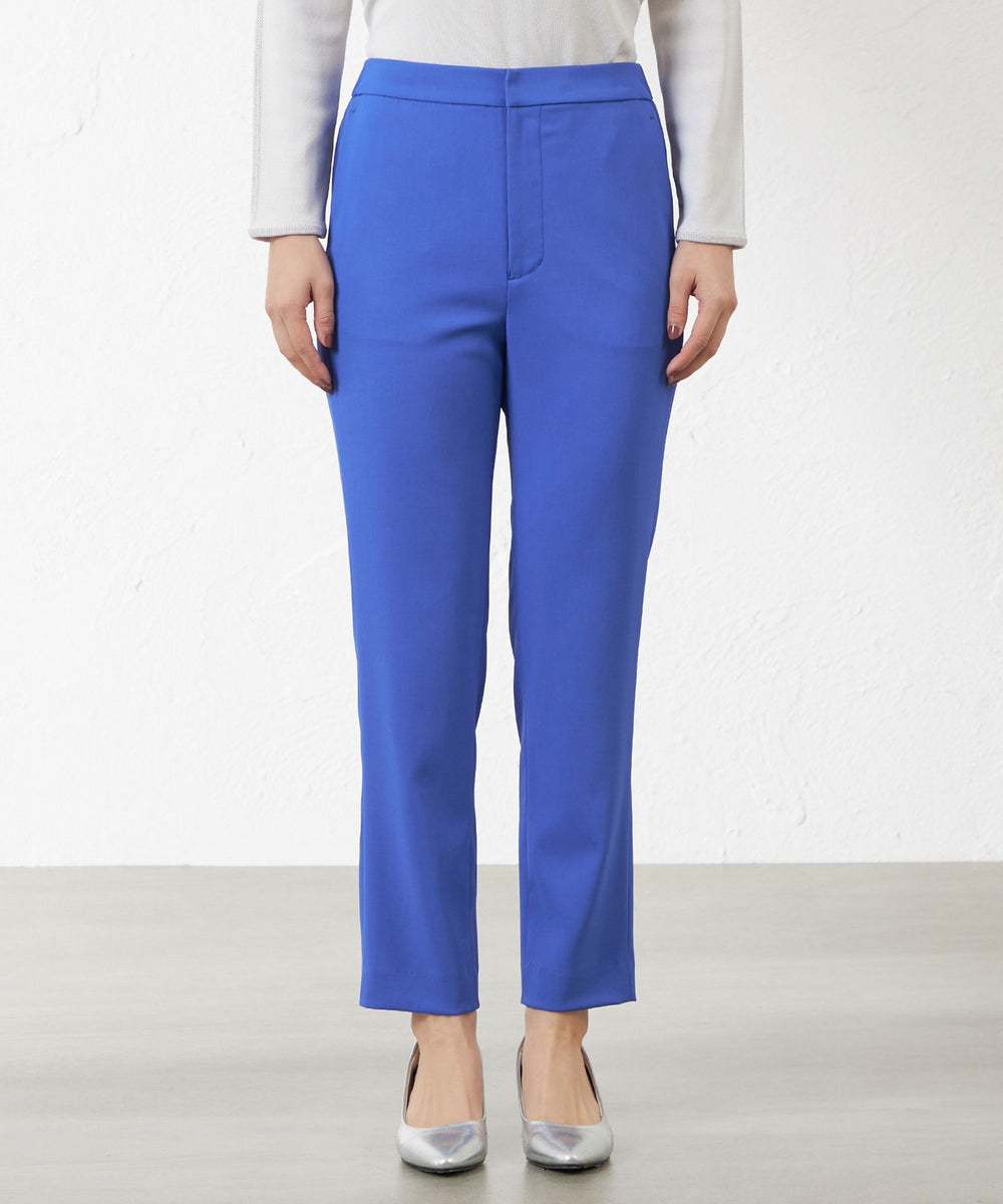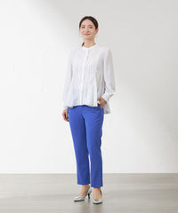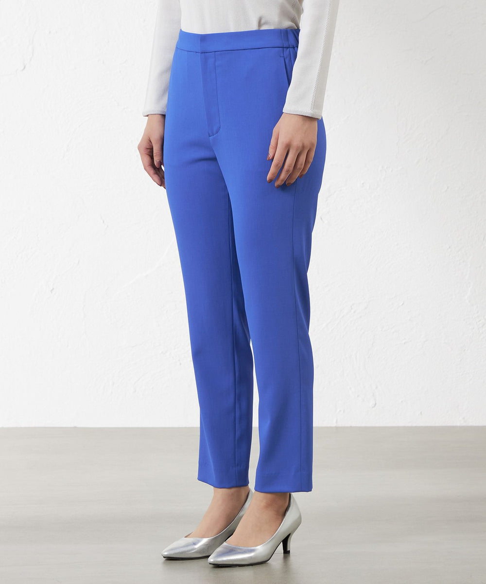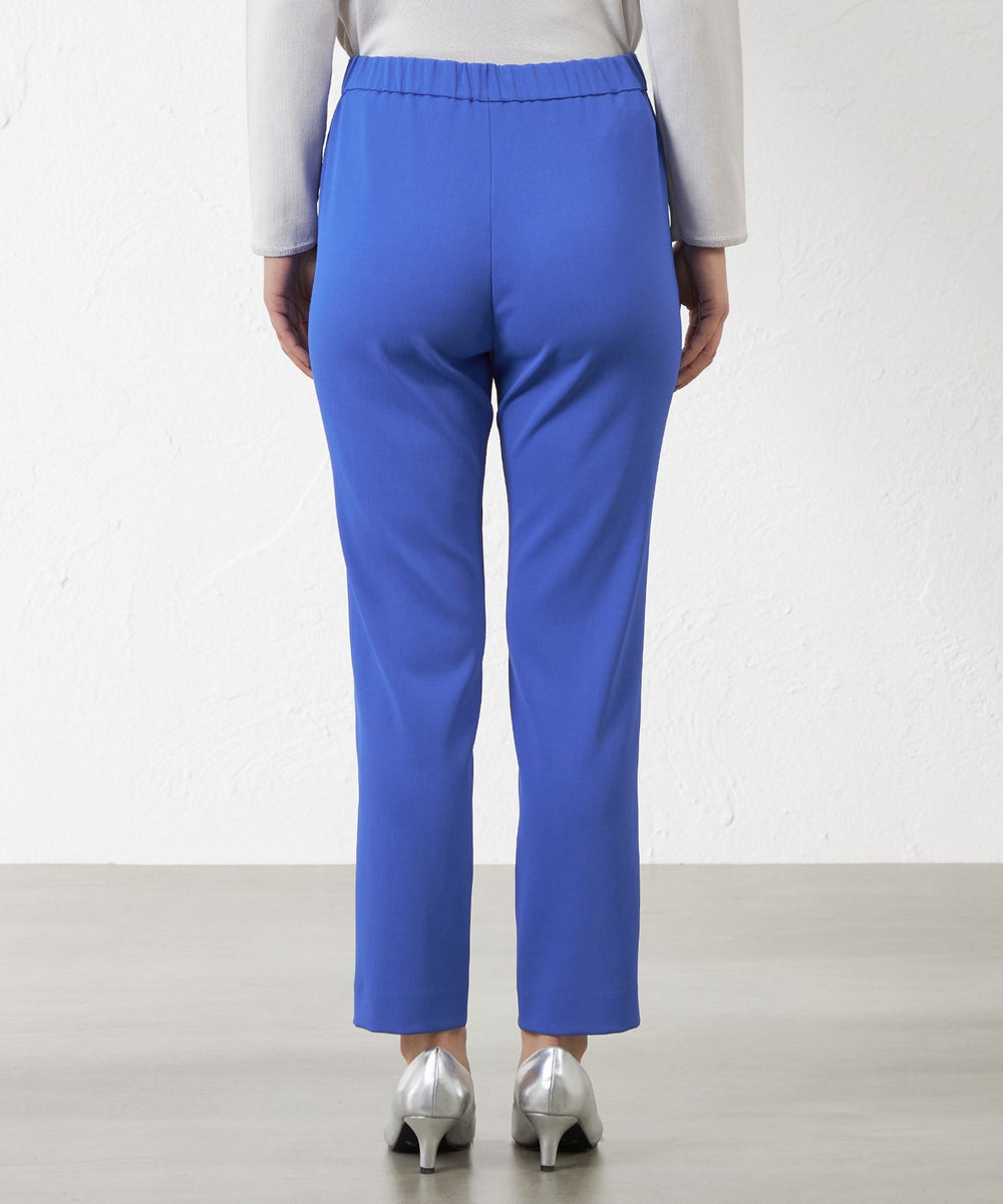 テーパードシルエットのパンツです。脇シームを前側にし、前巾を狭くすることによってすっきり見えするデザインです。ウエストは脇から後ろにかけてゴムギャザーを入れた伸縮性のある仕様です。