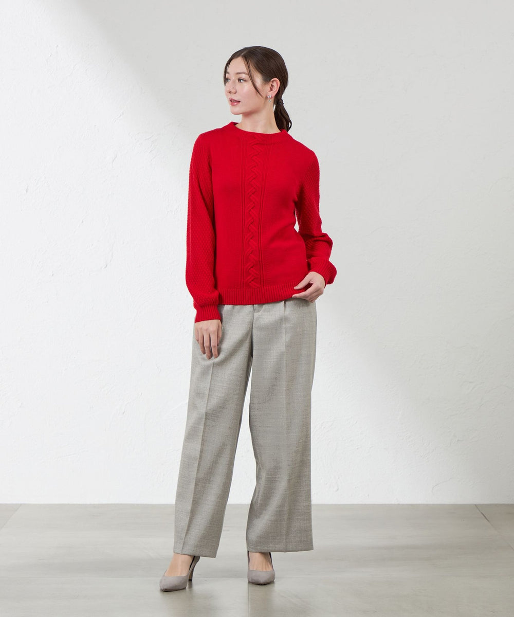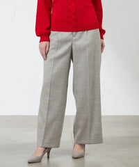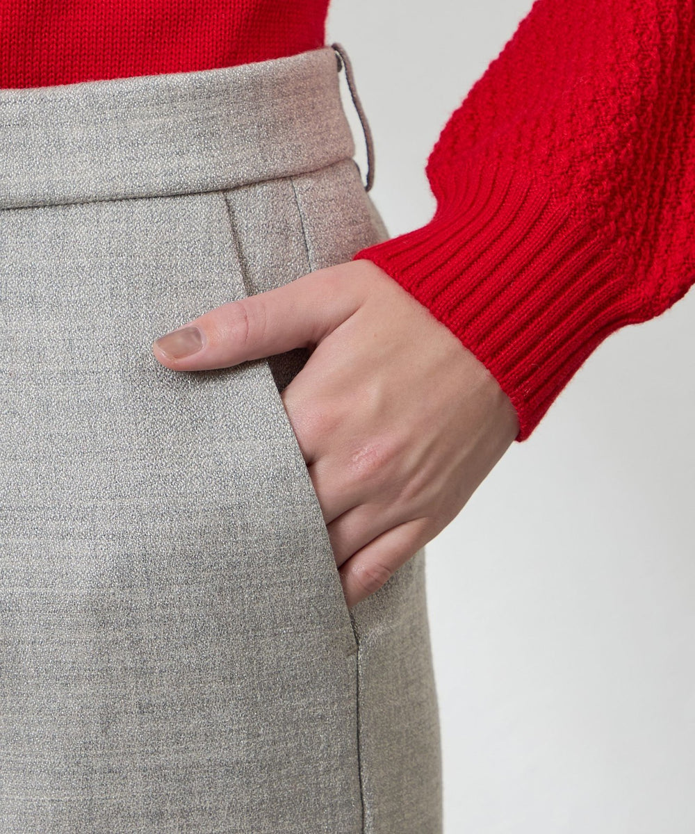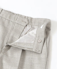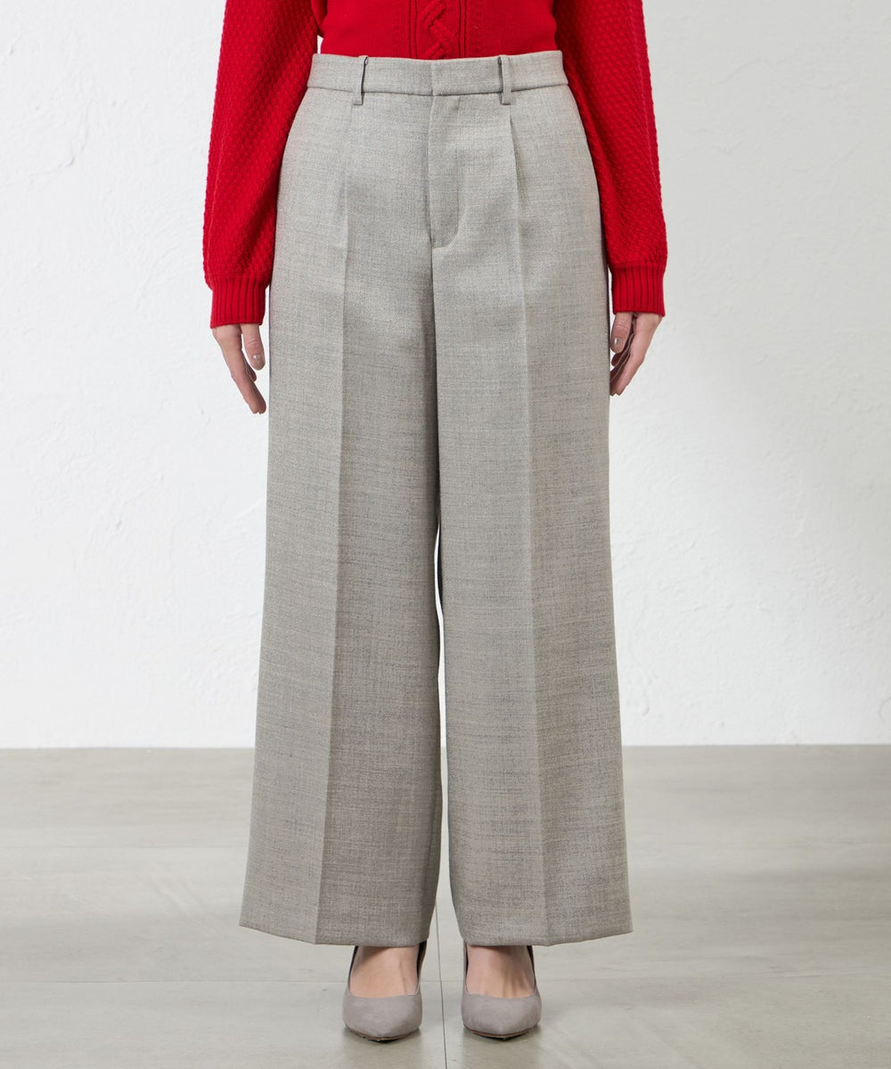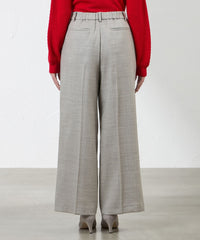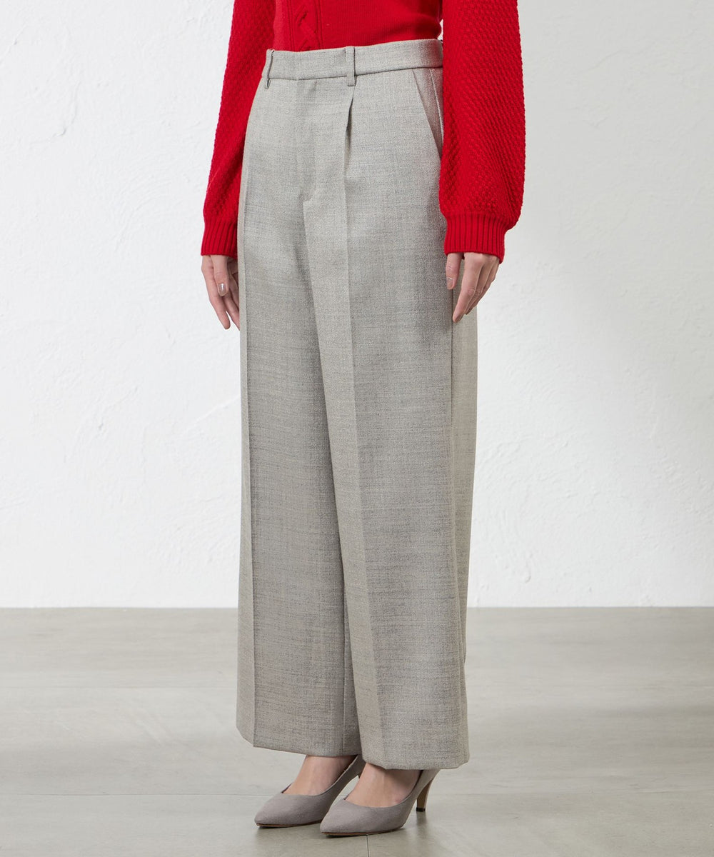 ワンタック入りのセミワイドパンツです。ヒップをすっぽり包み込むやや深めの股上から、裾へ向かう直線ラインが脚のラインを拾いすぎず、すっきりとした縦ラインをつくっています。ベルトは前後ゴム入り、後ろのみギャザーで伸縮性を持たせました。