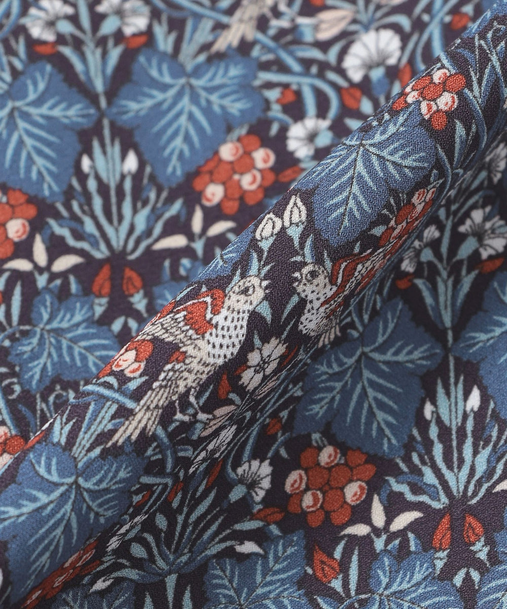 VineThief:ギリシャ神話の実りとワインの神ディオニュソスを、彼のシンボルであるブドウの木で表現しました。リバティアーカイブから発見したデザインをベースに、小さな花々、庭の鳥、そしてたわわに実ったブドウの木が、リバティらしいディテールと魅力にあふれたデザインになっています。