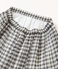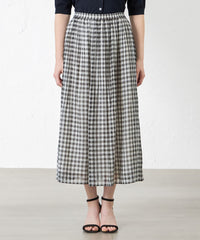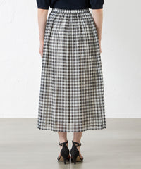 シアーなギンガムの素材にプリーツを施した、さらっと着れる夏らしいスカートです。ウエストはぐるりゴムなので着心地も抜群で、Tシャツと合わせて夏らしいスタイリングをお楽しみいただけます!