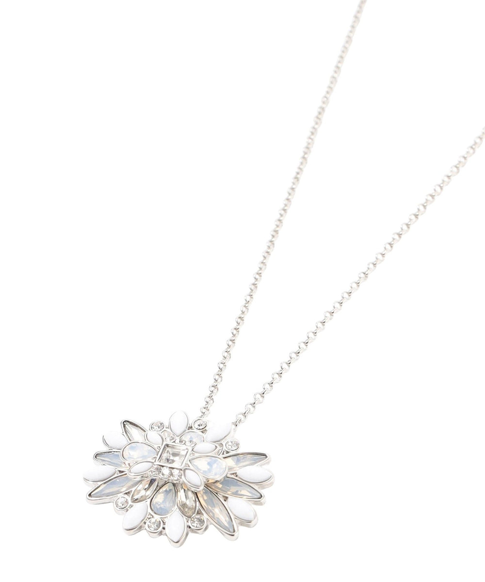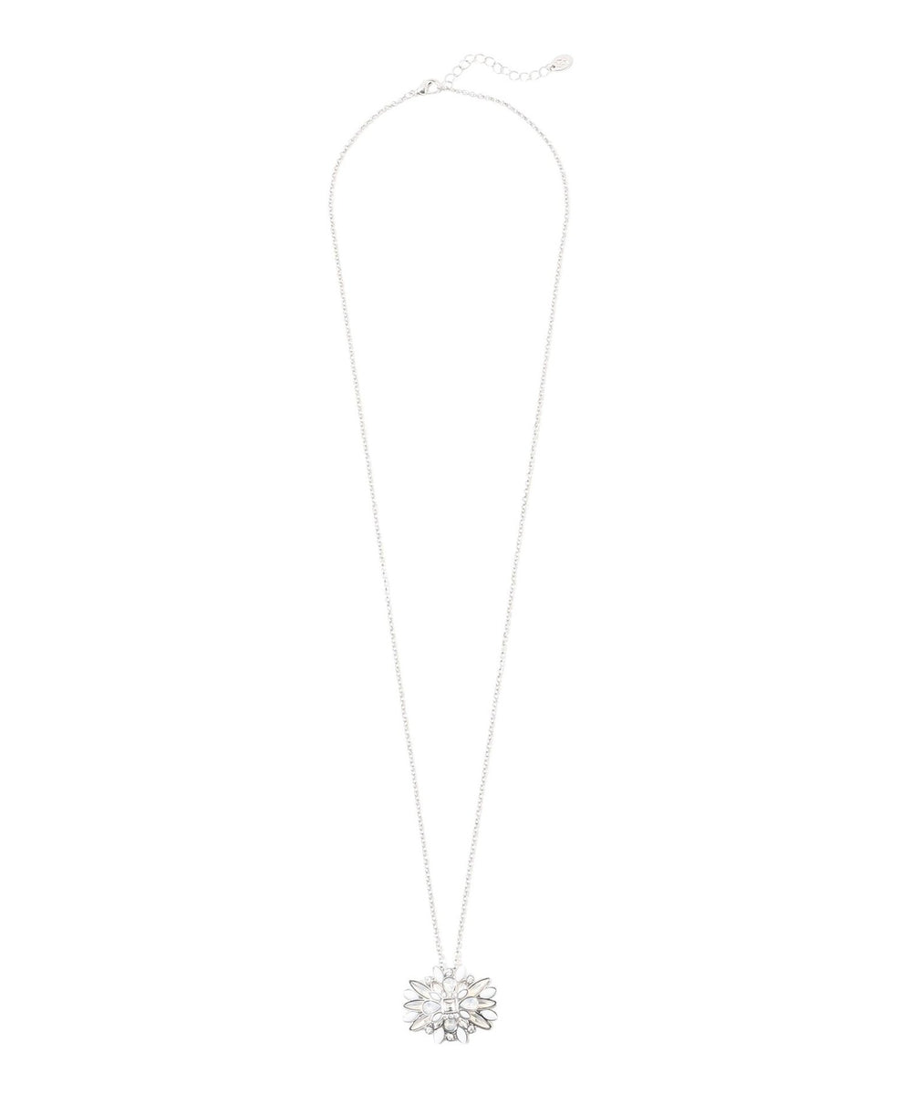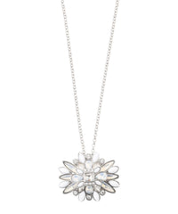 AMACA20周年としてウエアで展開するリバティの「リボンメダリオン」からインスパイアされたデザインでネックレスを製作しました。二段づくりにした手の込んだ型を起こして立体感をもたせ、カラーの美しいガラスやアクリルをはめ込んでいます。無地のブラウスやニットのアクセントとしてもよく映えます。