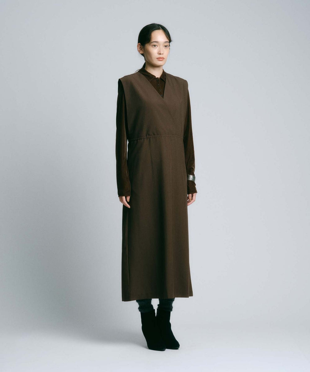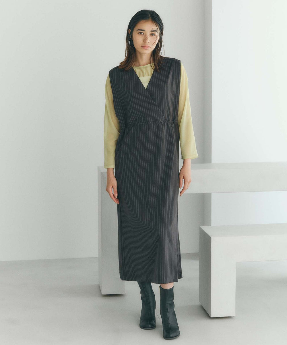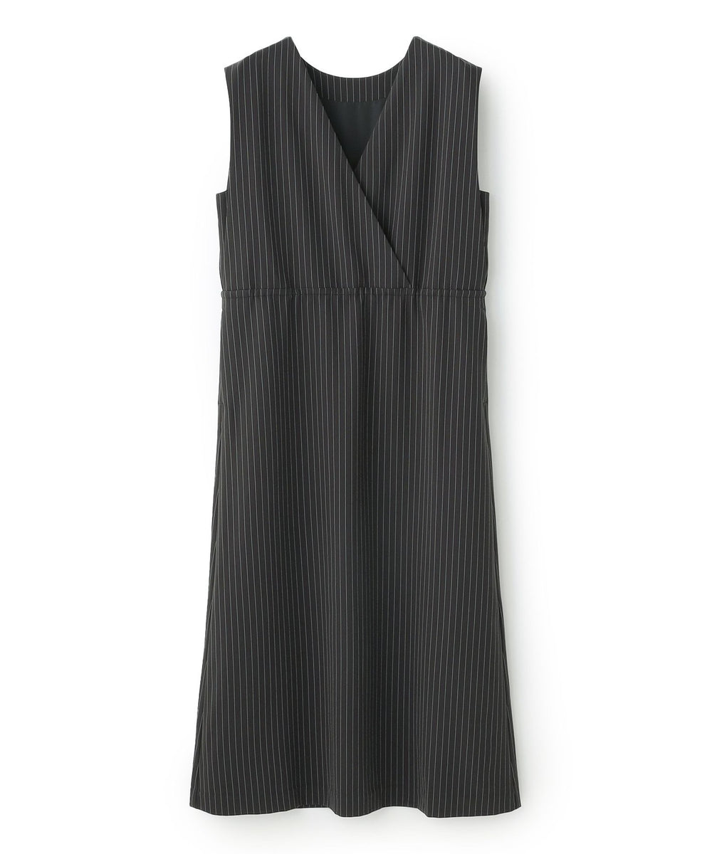 きれいめのピンストライプと無地のダークブラウン、それぞれ上品な印象を与えるナローシルエットのワンピース。前後2WAYで着られる仕様で、カシュクール、ラウンドネックと気分やシーンに合わせて着こなしを変えられます。ほどよいボディのIラインシルエットで窮屈感がなく、オンオフ問わず活躍するデザインです。ウエスト内側にドロストを配し、ウエストをブラウジングさせて丈の調整も可能に。上身頃のみに裏地がついているので、透けにくくインナーのバリエーションを選ばずに着脱がしやすい仕様です。