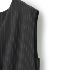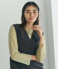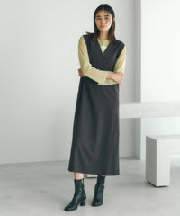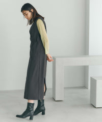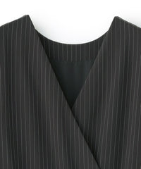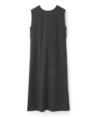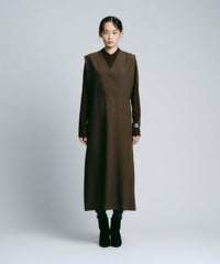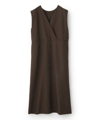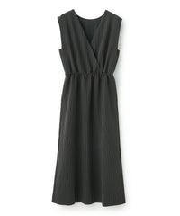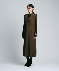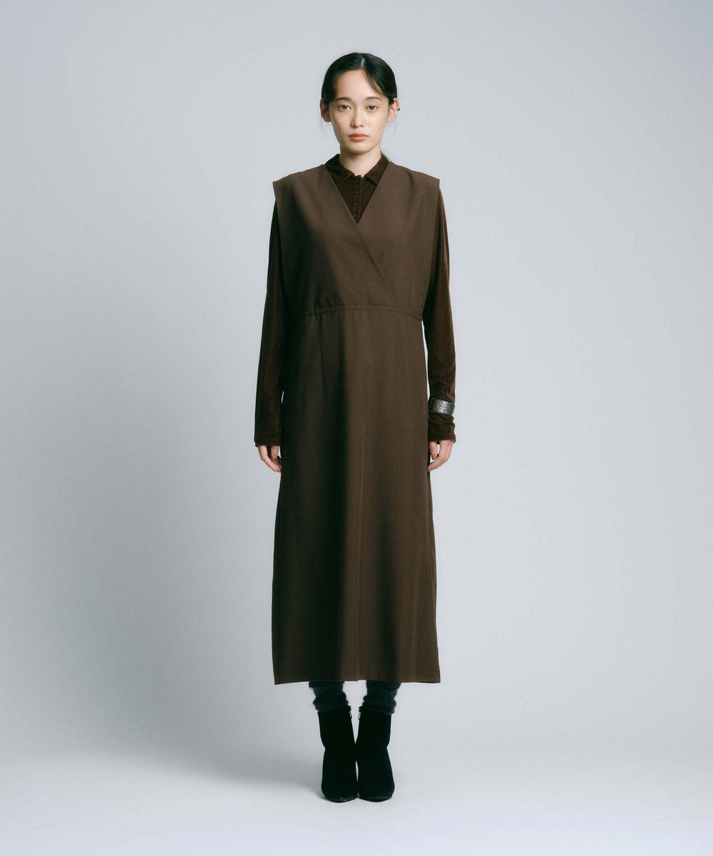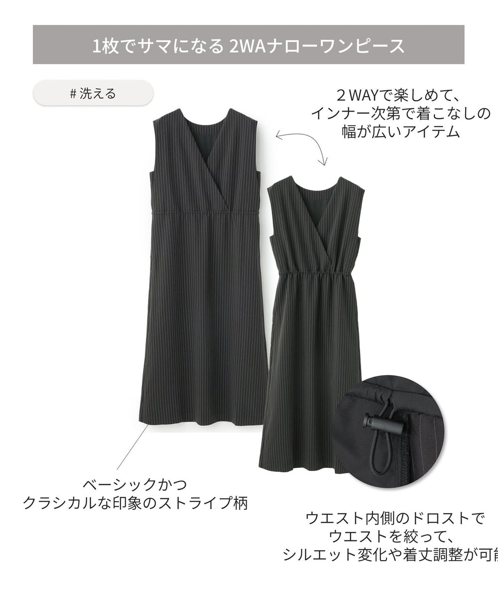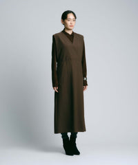 きれいめのピンストライプと無地のダークブラウン、それぞれ上品な印象を与えるナローシルエットのワンピース。前後2WAYで着られる仕様で、カシュクール、ラウンドネックと気分やシーンに合わせて着こなしを変えられます。ほどよいボディのIラインシルエットで窮屈感がなく、オンオフ問わず活躍するデザインです。ウエスト内側にドロストを配し、ウエストをブラウジングさせて丈の調整も可能に。上身頃のみに裏地がついているので、透けにくくインナーのバリエーションを選ばずに着脱がしやすい仕様です。