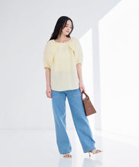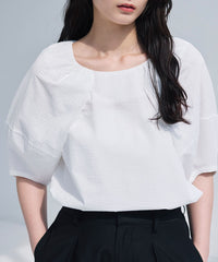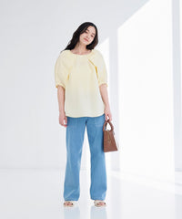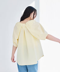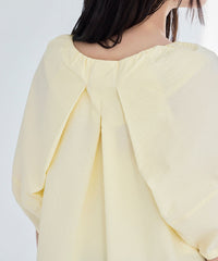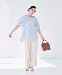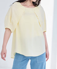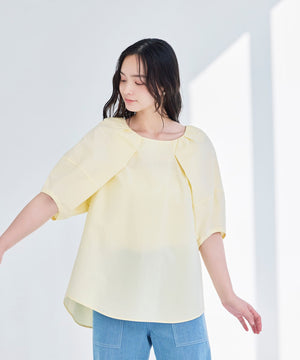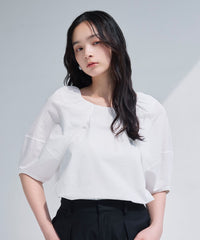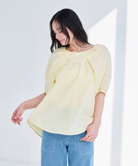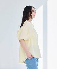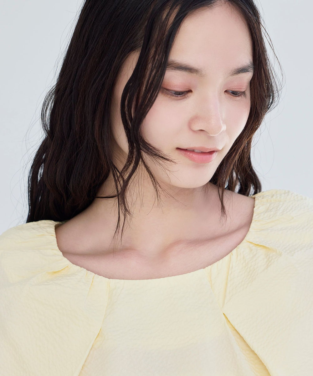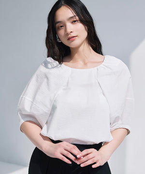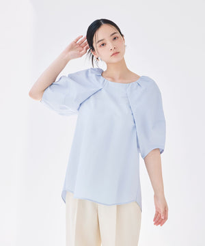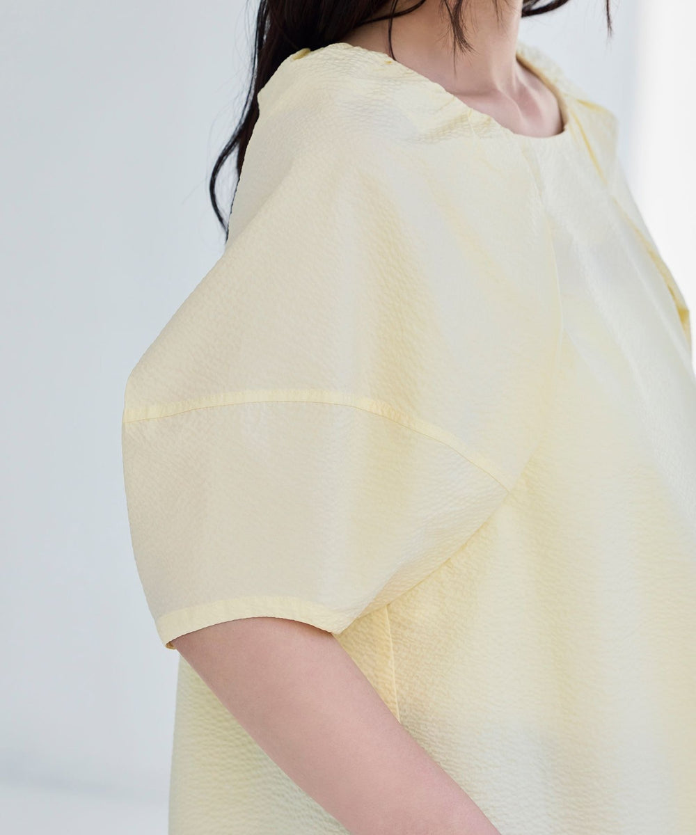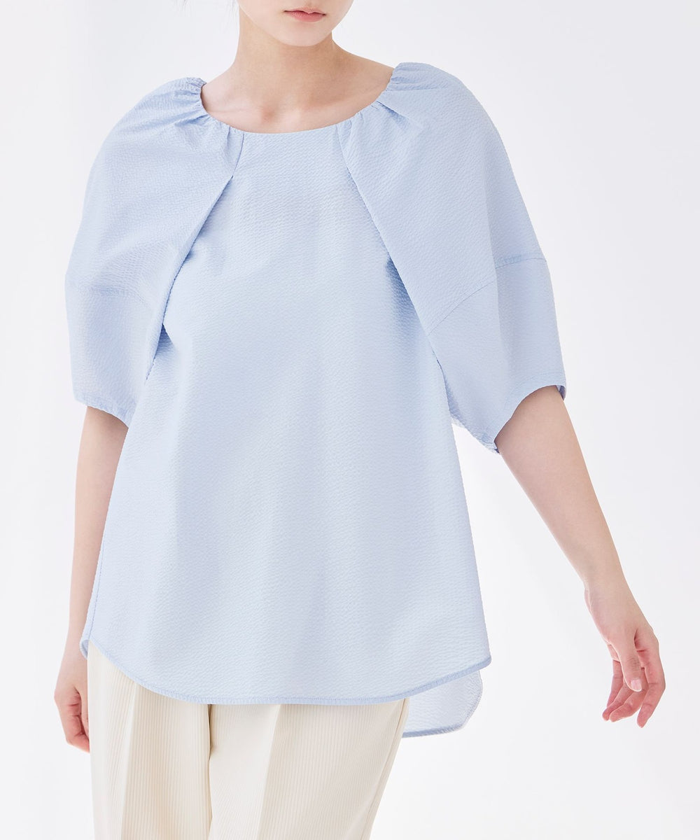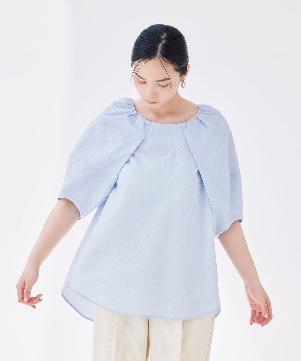 コットン100%のサッカー素材を採用。独特の凹凸感が肌との接触面を減らし、通気性を向上。軽くて清涼感のある素材なので快適な着心地です。薄地でありながら、ハリ感のある素材がボリューム袖の美しいシルエットを演出します。