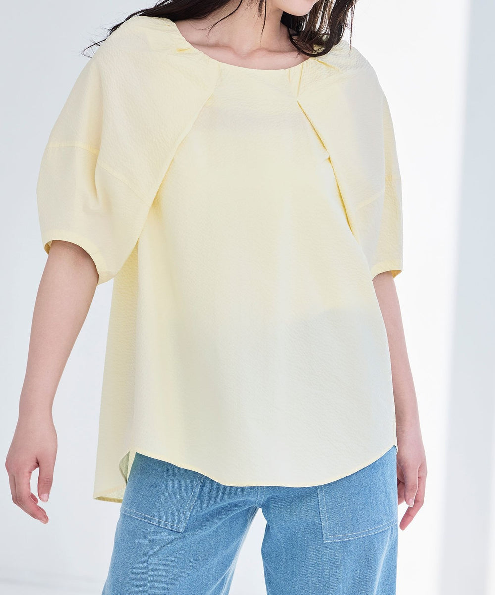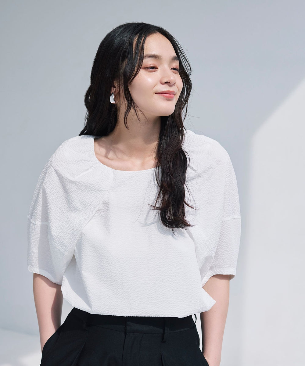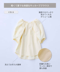 ゆとりあるシルエットと軽やかで涼しいサッカー素材が、春夏活躍すること間違いなしのアイテム。露出が増える夏、ボリューム袖が二の腕をさりげなくカバーしてくれるので、体型カバーも叶いますよ!