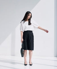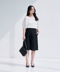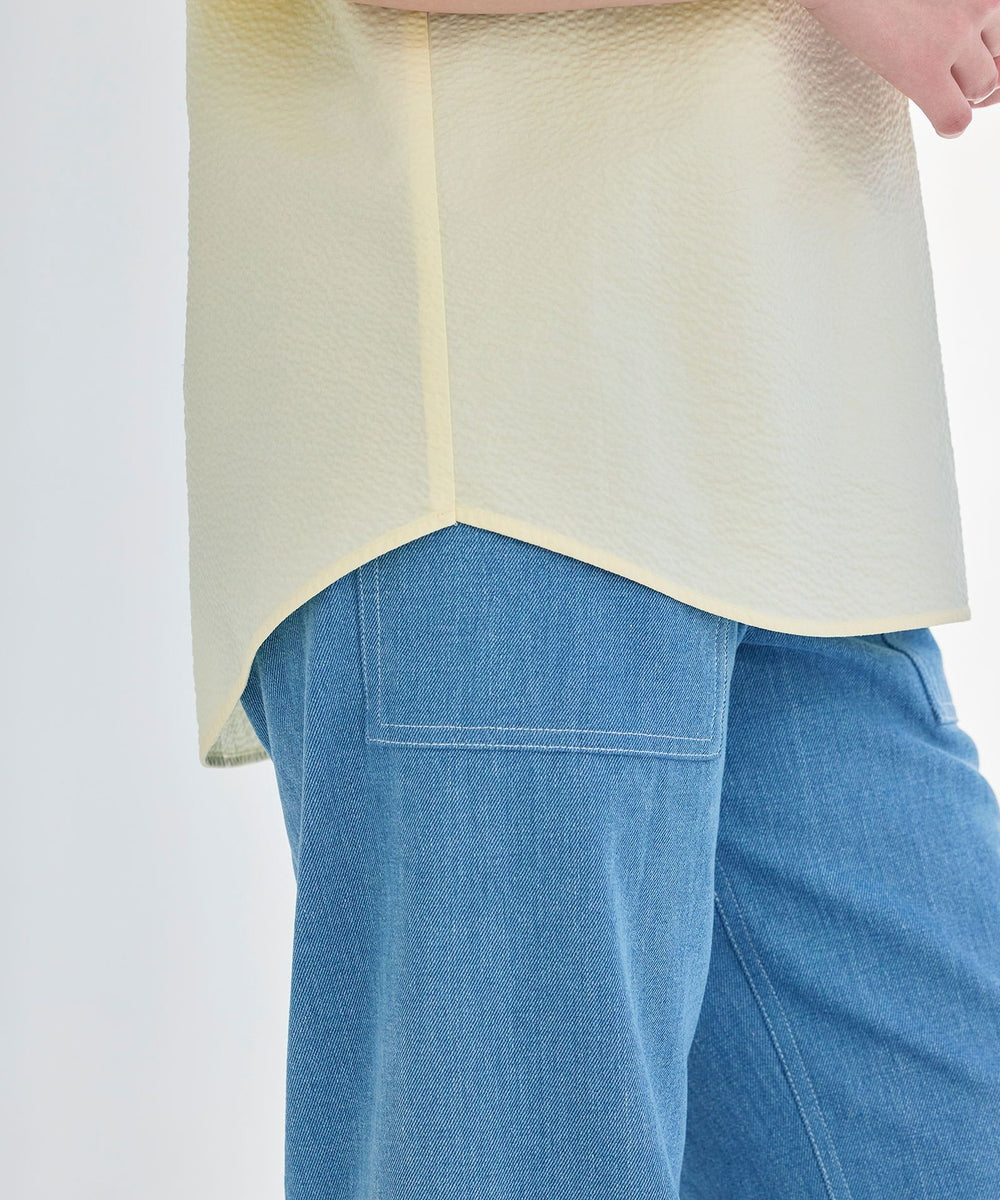 凹凸感のある素材を活かしたボリューム袖が、腕周りをすっきりと見せます。裾のラウンドデザインでトップスインもアウトも自在。幅広いスタイリングに対応する多用途な一枚です。