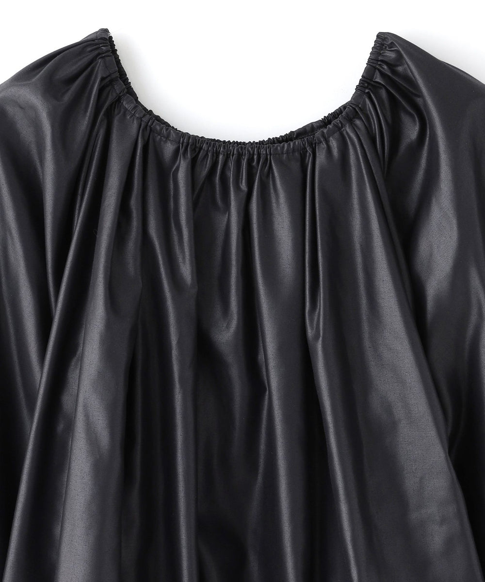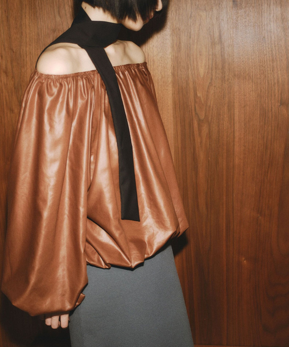 ●光沢素材によるギャザー&ドレープがモード感とエレガントさを両立