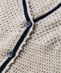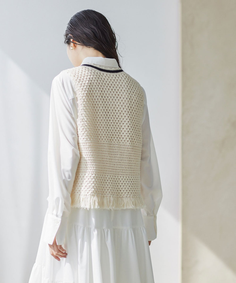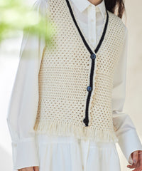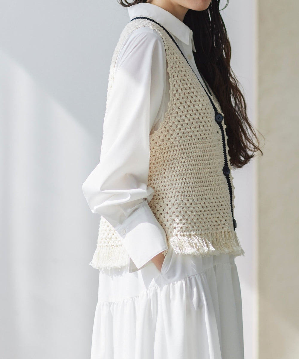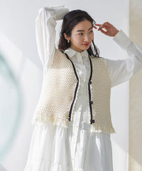 かぎ針を使って一つ一つ丁寧に編み上げられた手編みニットジレ。