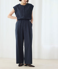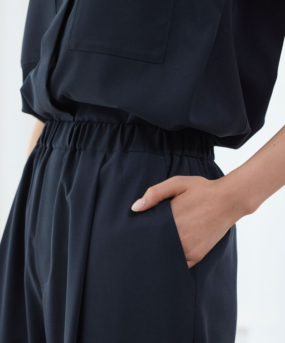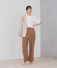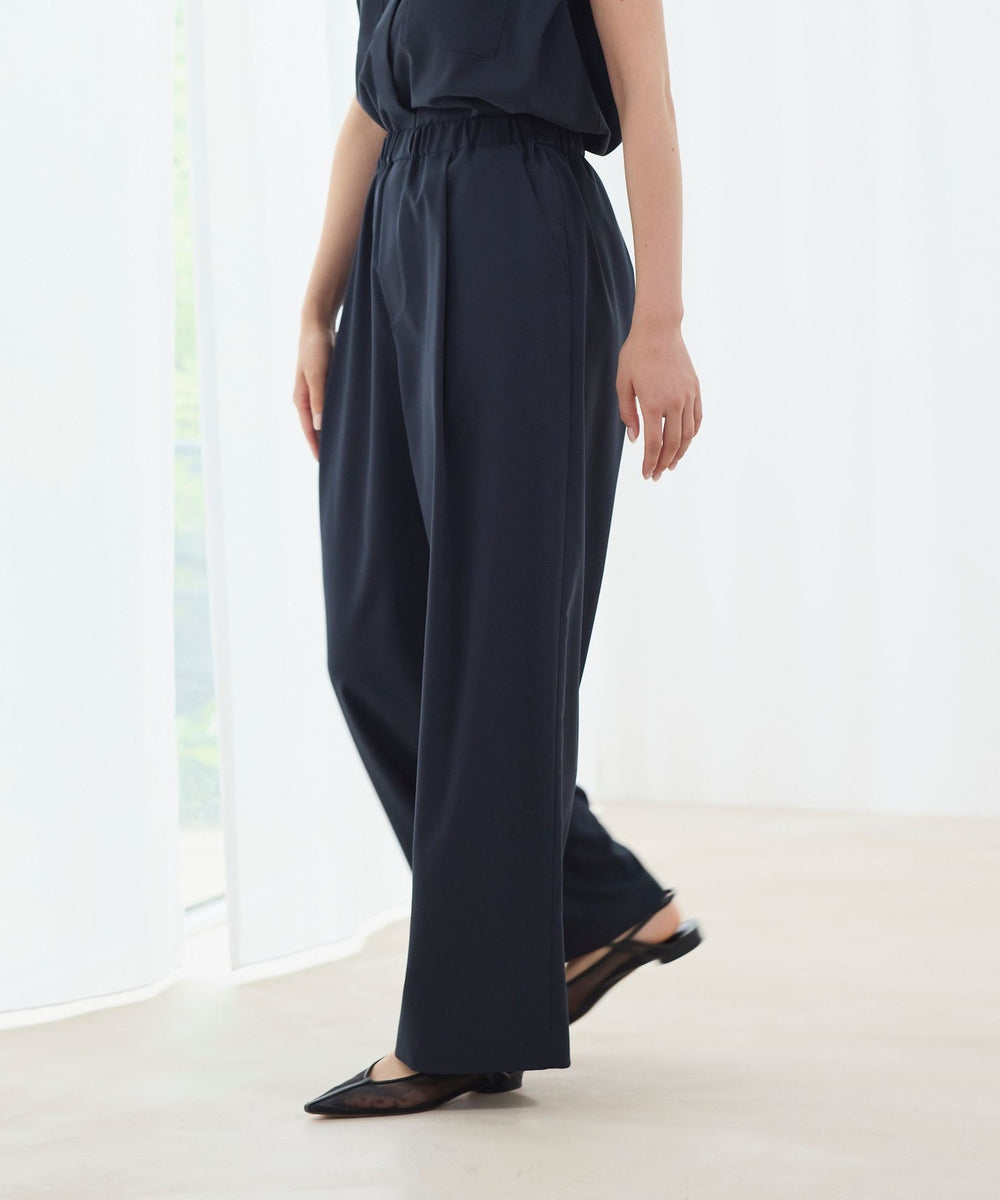セットアップ着用でコーディネートが完成する便利なアイテム!深めのタックが脚をすらりときれいに見せつつ、ウエストはゴム仕様なので食事後も窮屈感がなく一日中快適に過ごせます。接触冷感素材なので、暑い季節も快適に着られ、洗濯ジワも付きにくくお手入れも簡単です。オフィスからお出かけまで幅広く活躍する一着です。
