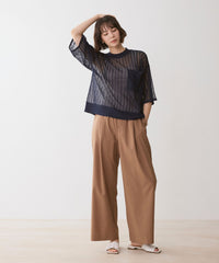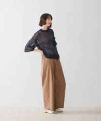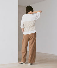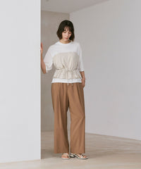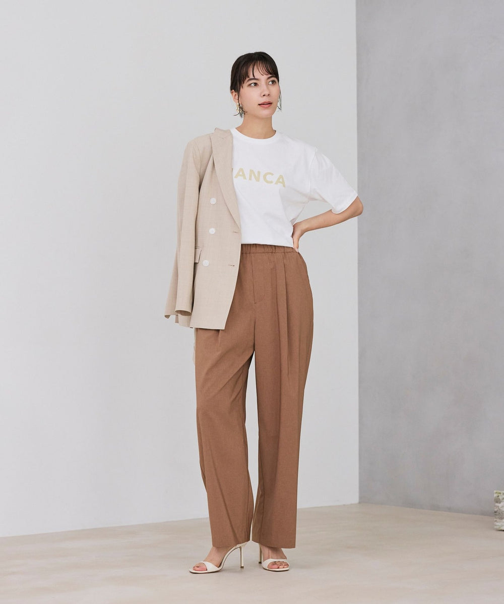一枚でサマになるイージーパンツ。ウエストから施された深めのタックが脚長効果を演出し、スタイルアップを叶えます。セットアップのブラウス(品番:W1M15552)と着用でハンサムな印象に、単品使いではエレガントな魅力を引き出します。ウエストはゴム仕様で、美しいシルエットと快適な着心地を両立しました。