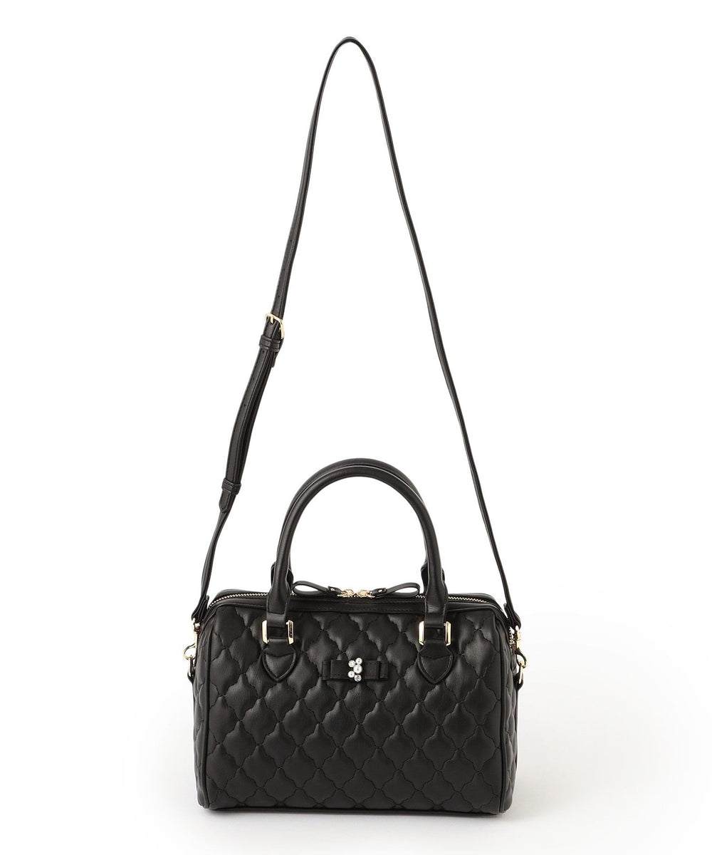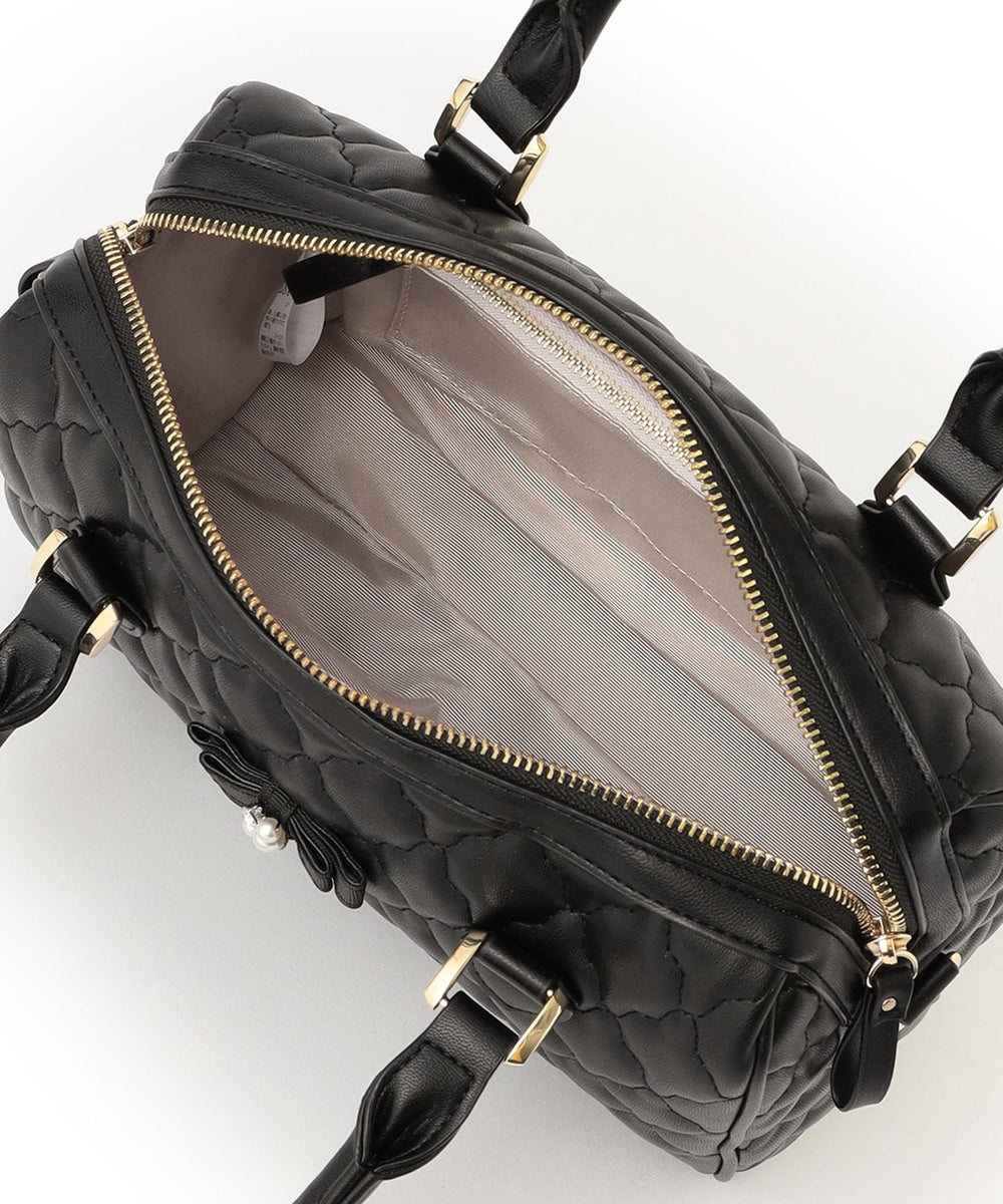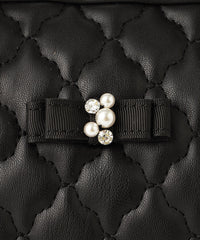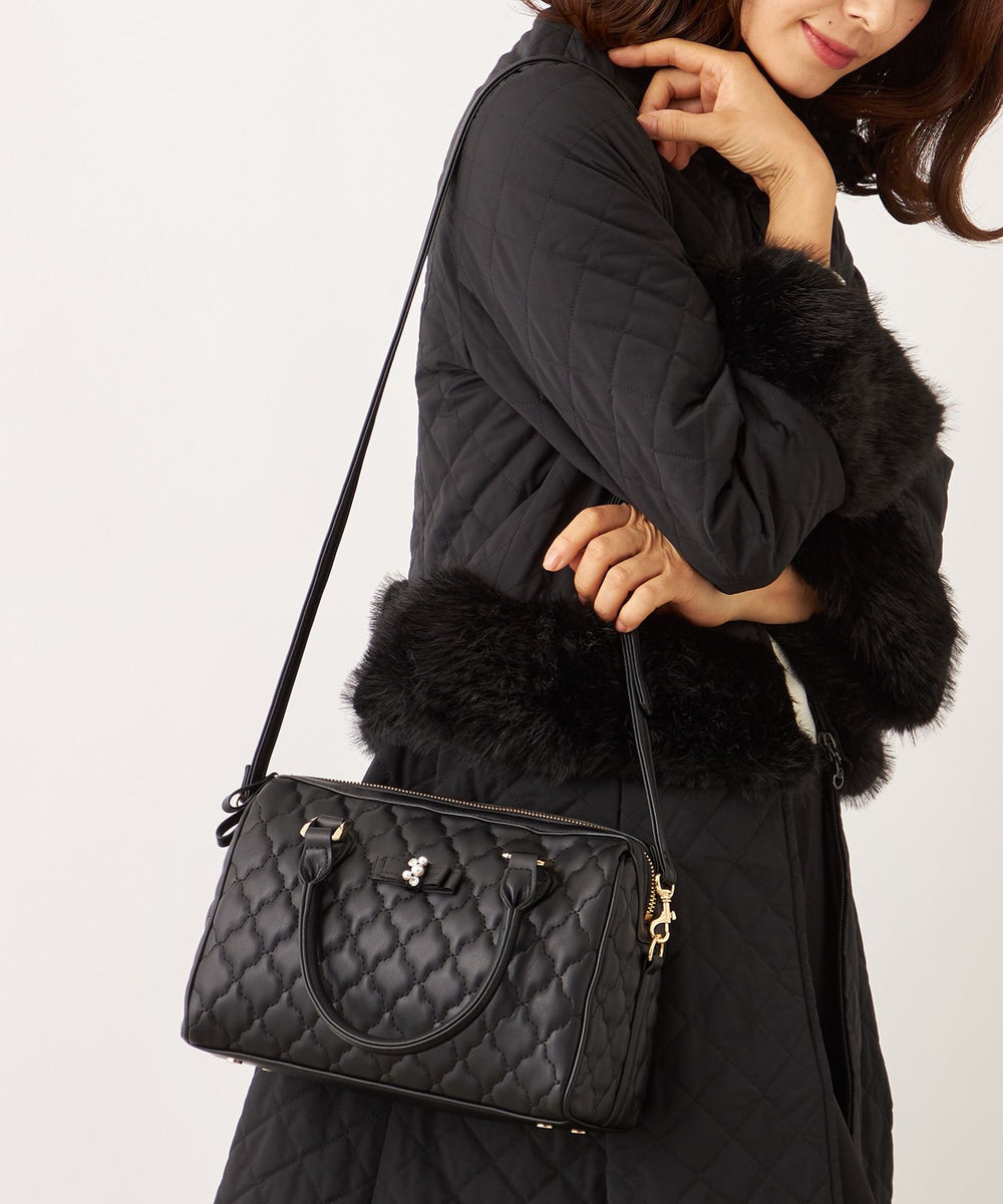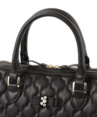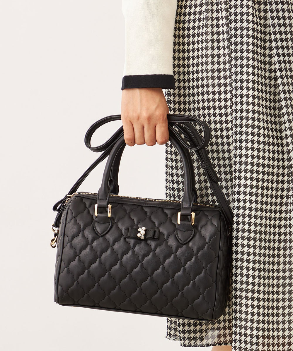 マットな合皮にオリジナル柄のキルトを施したボストンバッグです。フロントのリボンの中央にガラスビジューやパール調パーツをあしらいポイントにしました。コンパクトながらもマチがしっかりとありますので、見た目よりもしっかりと物が収納できます。取り外しできるショルダーストラップで、肩掛けやクロスボディでお持ちいただけます。