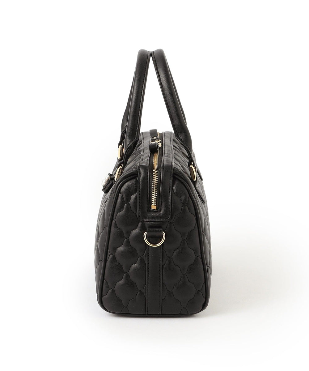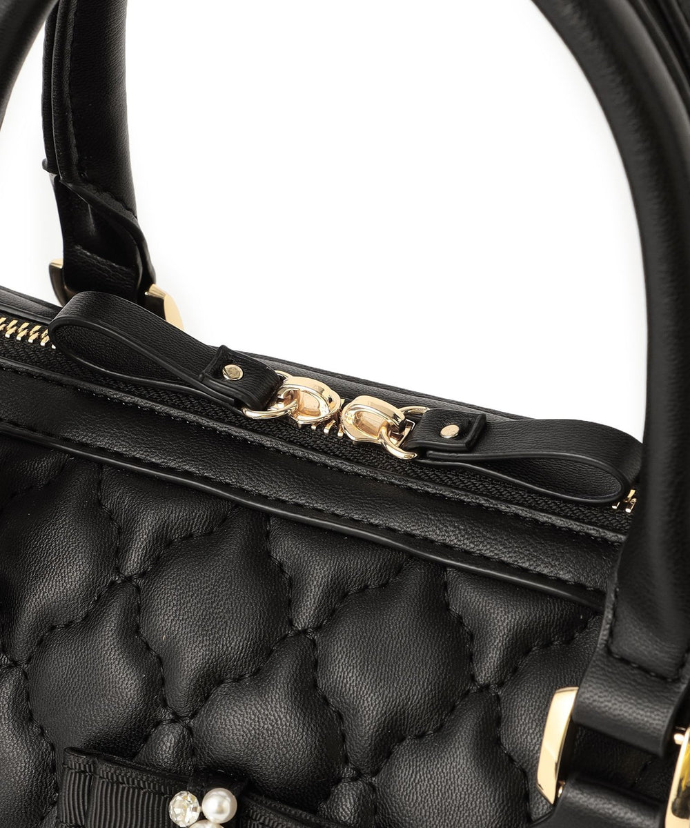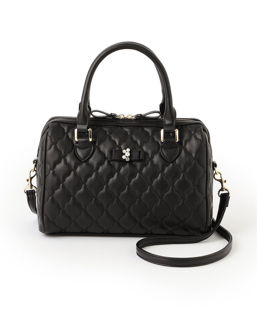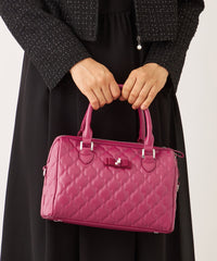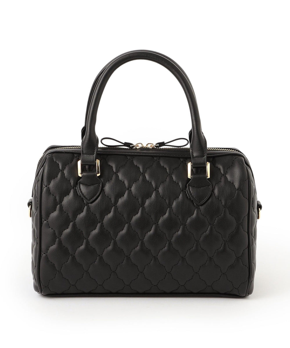マットな合皮にオリジナル柄のキルトを施したボストンバッグです。フロントのリボンの中央にガラスビジューやパール調パーツをあしらいポイントにしました。コンパクトながらもマチがしっかりとありますので、見た目よりもしっかりと物が収納できます。取り外しできるショルダーストラップで、肩掛けやクロスボディでお持ちいただけます。