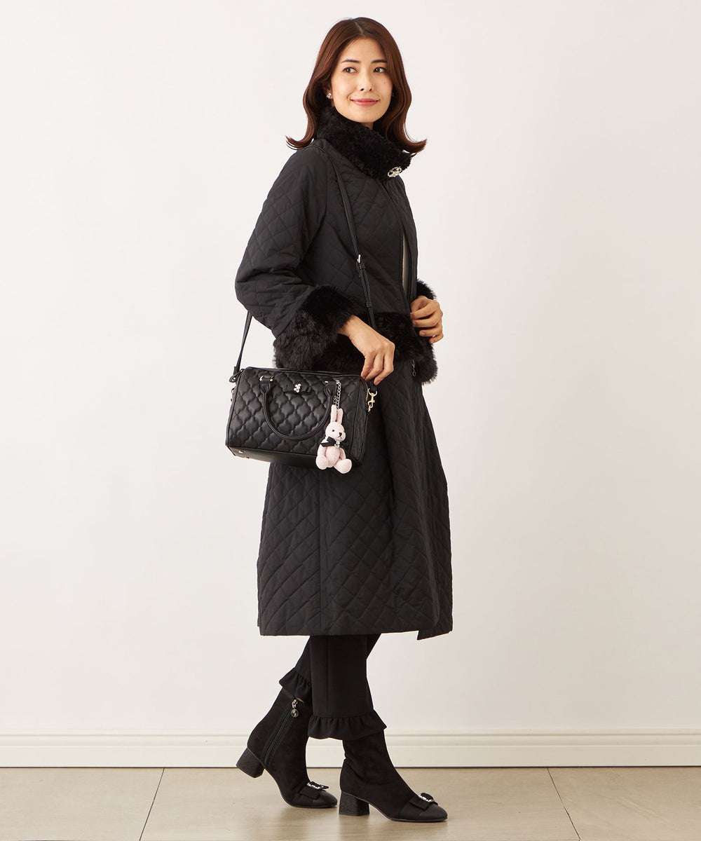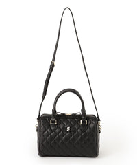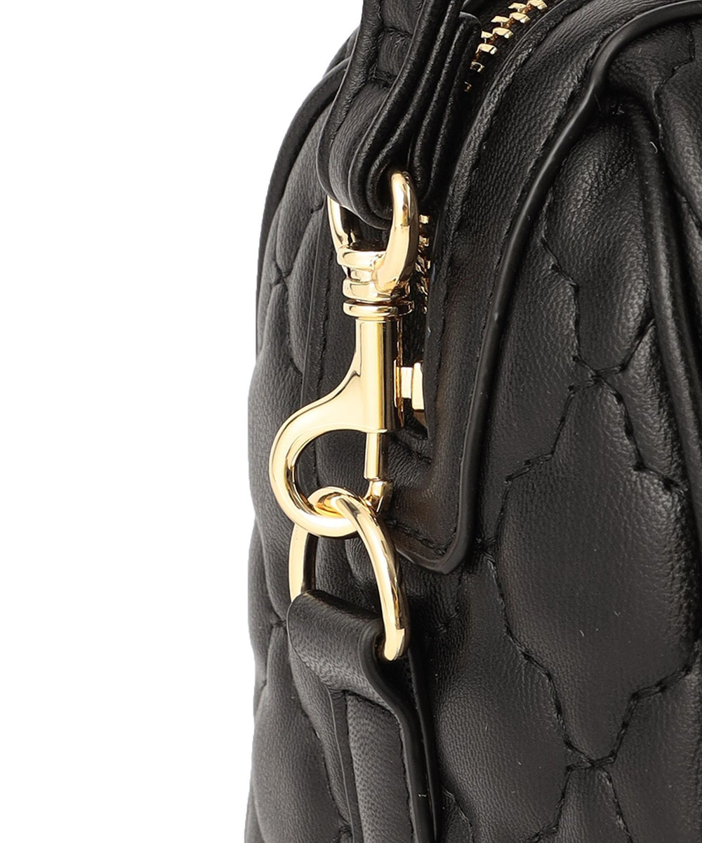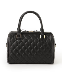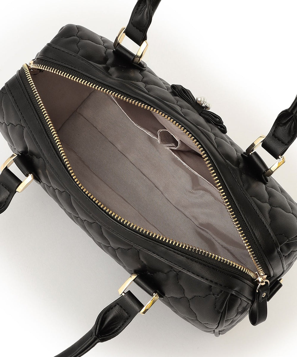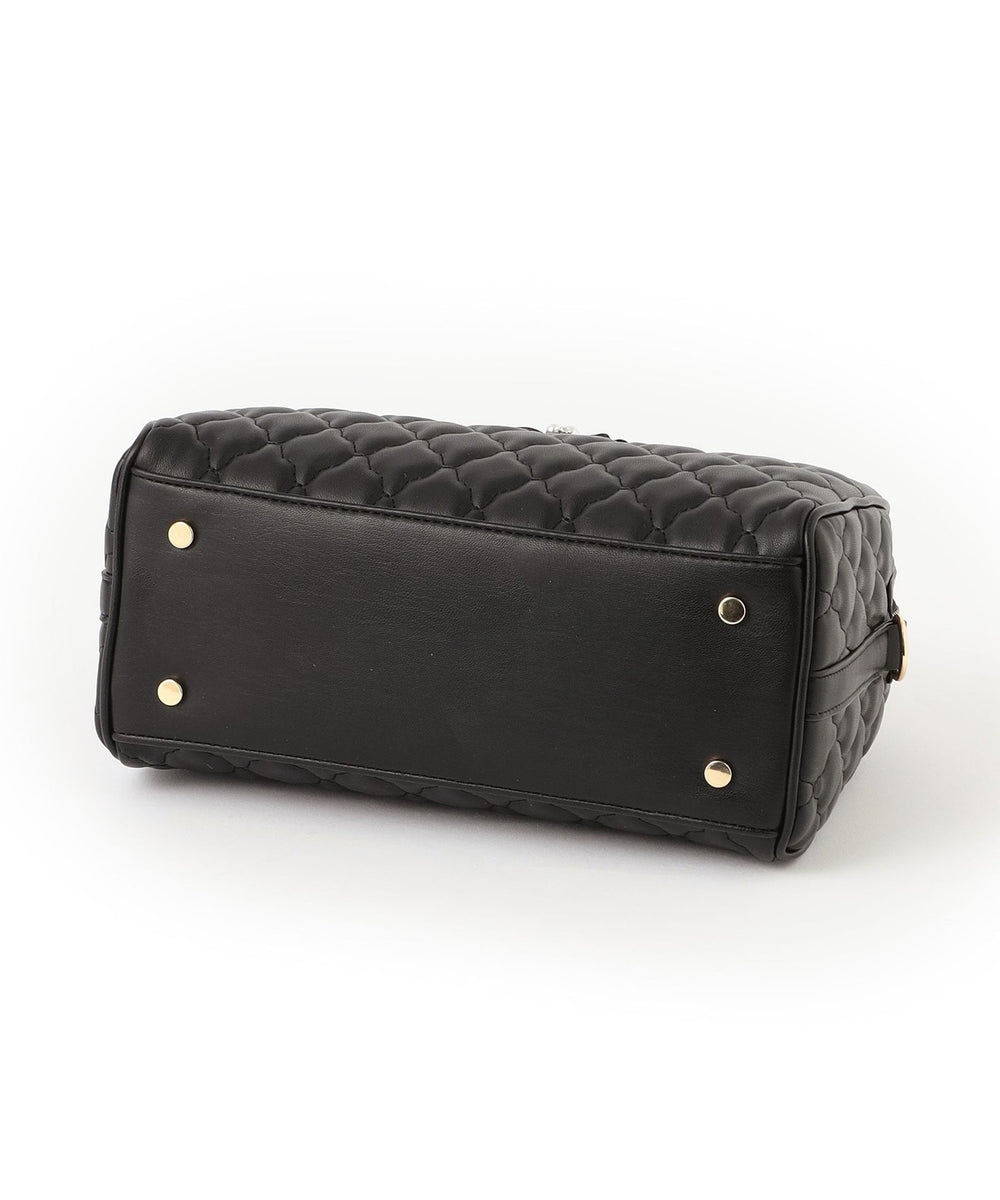 マットな合皮にオリジナル柄のキルトを施したボストンバッグです。フロントのリボンの中央にガラスビジューやパール調パーツをあしらいポイントにしました。コンパクトながらもマチがしっかりとありますので、見た目よりもしっかりと物が収納できます。取り外しできるショルダーストラップで、肩掛けやクロスボディでお持ちいただけます。