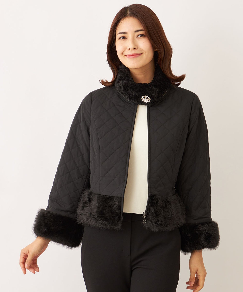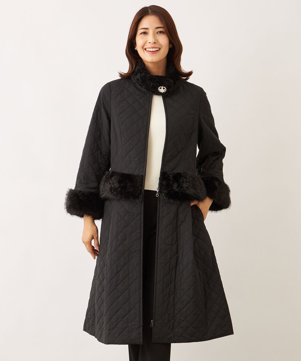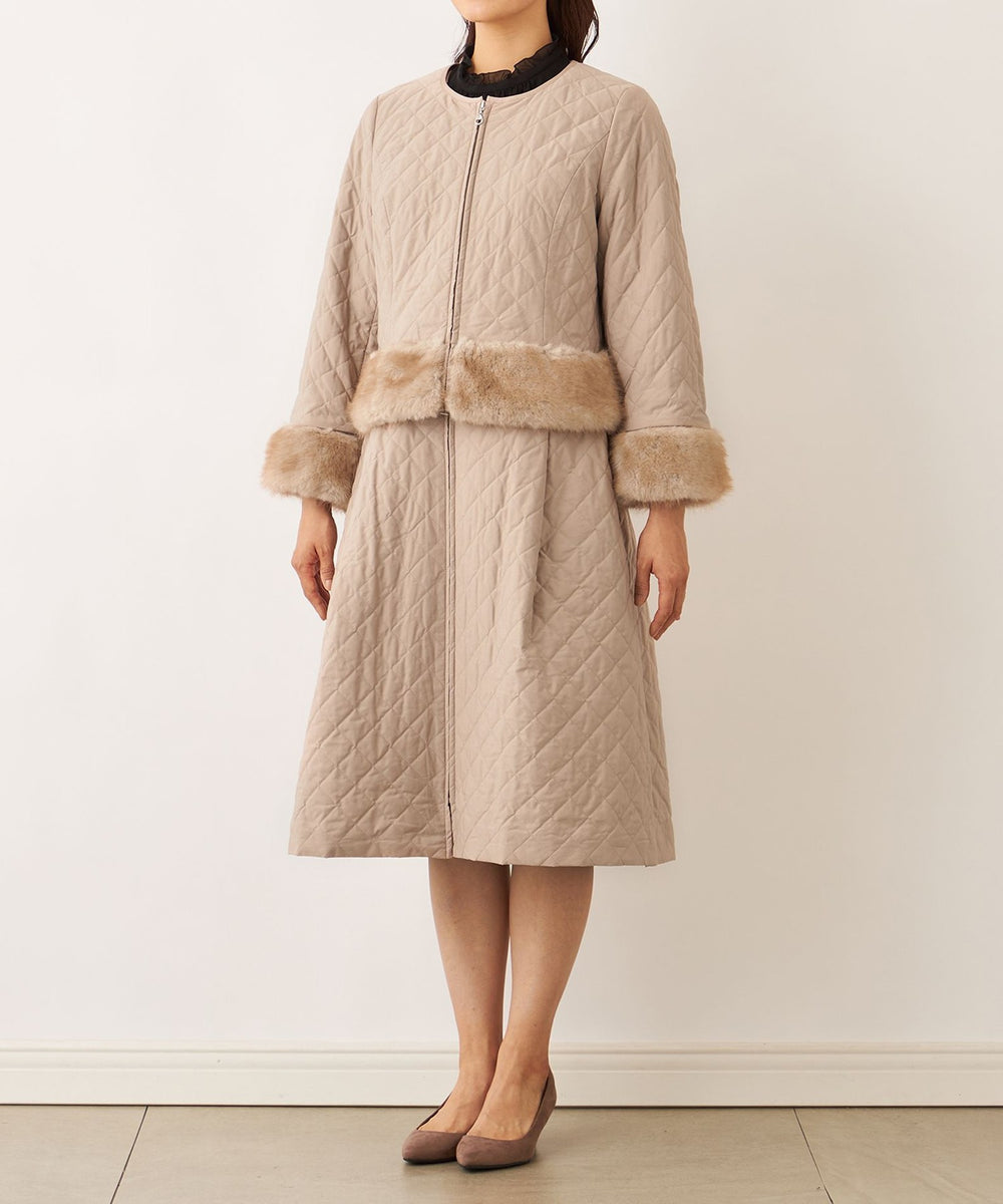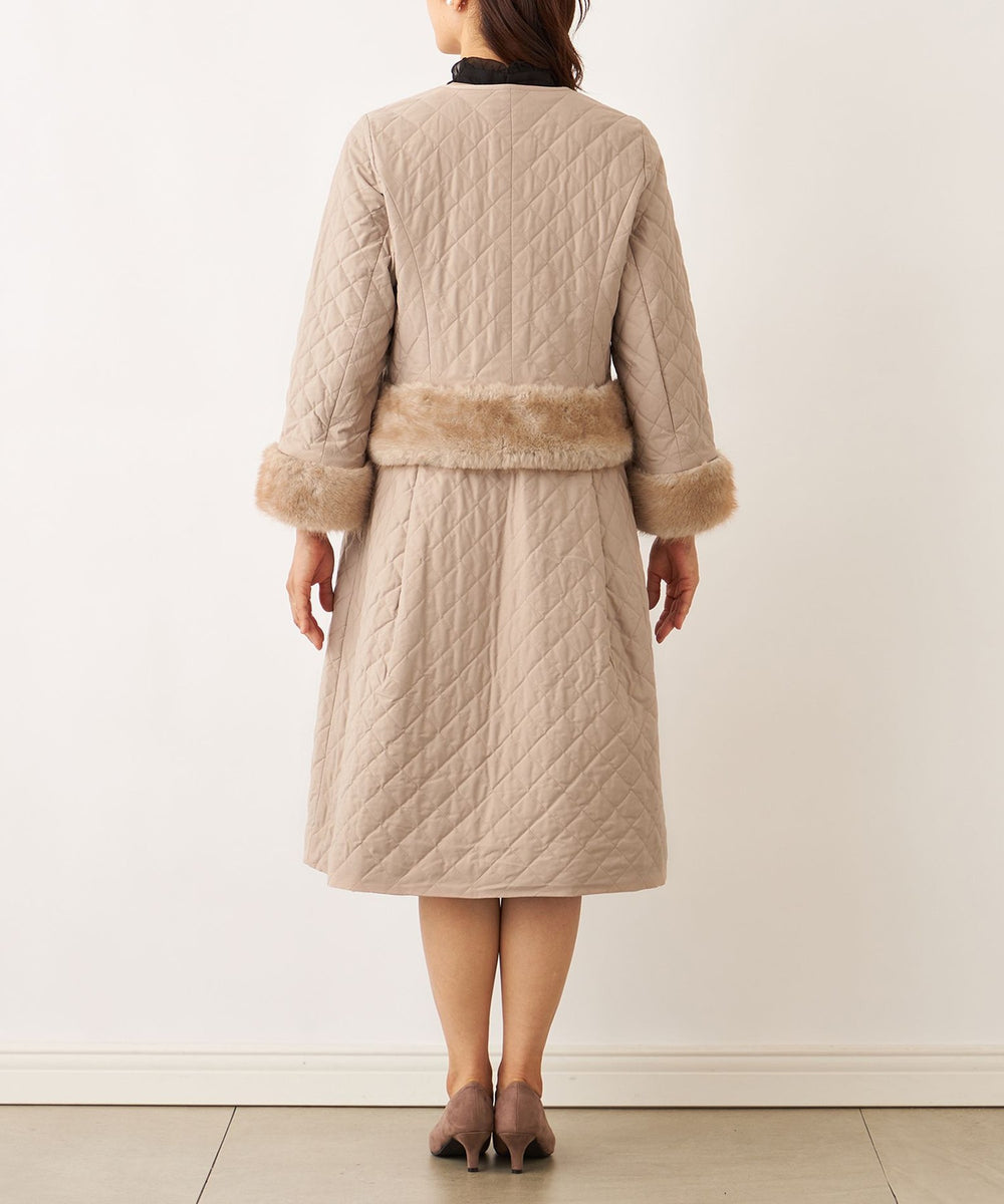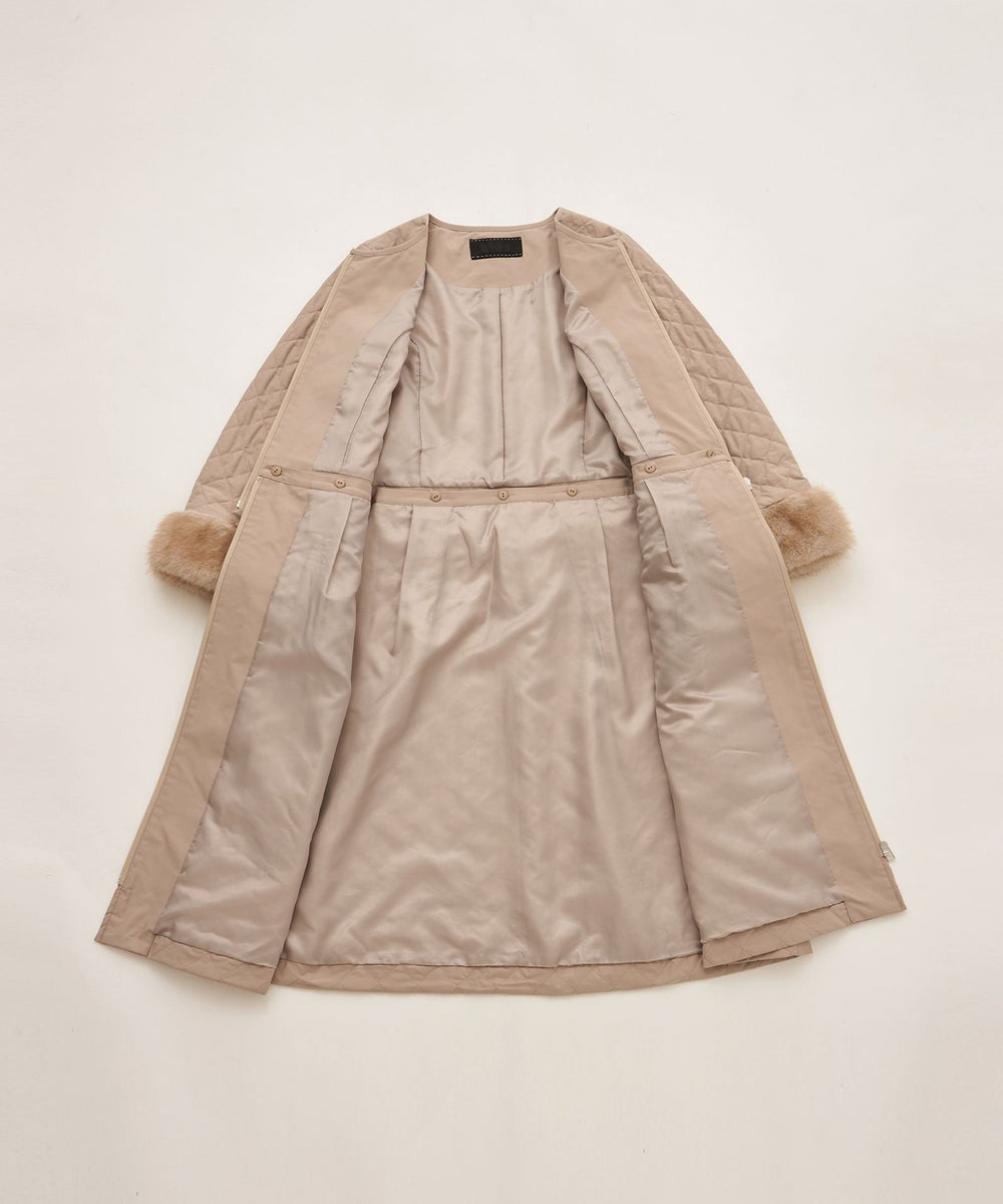 フェイクファー付きのキルトロングコートで、腰回りのファー内側にレンズ釦を配し、スカート部分を着脱可能な仕様にすることで、裾ファー付きのショートジャケットとしても着用できます。さらに、袖口のファーも取り外し可能で、気候やコーディネートに応じて丈感やアイテムを自在に変化させられる2WAY仕様のコートです。