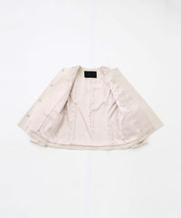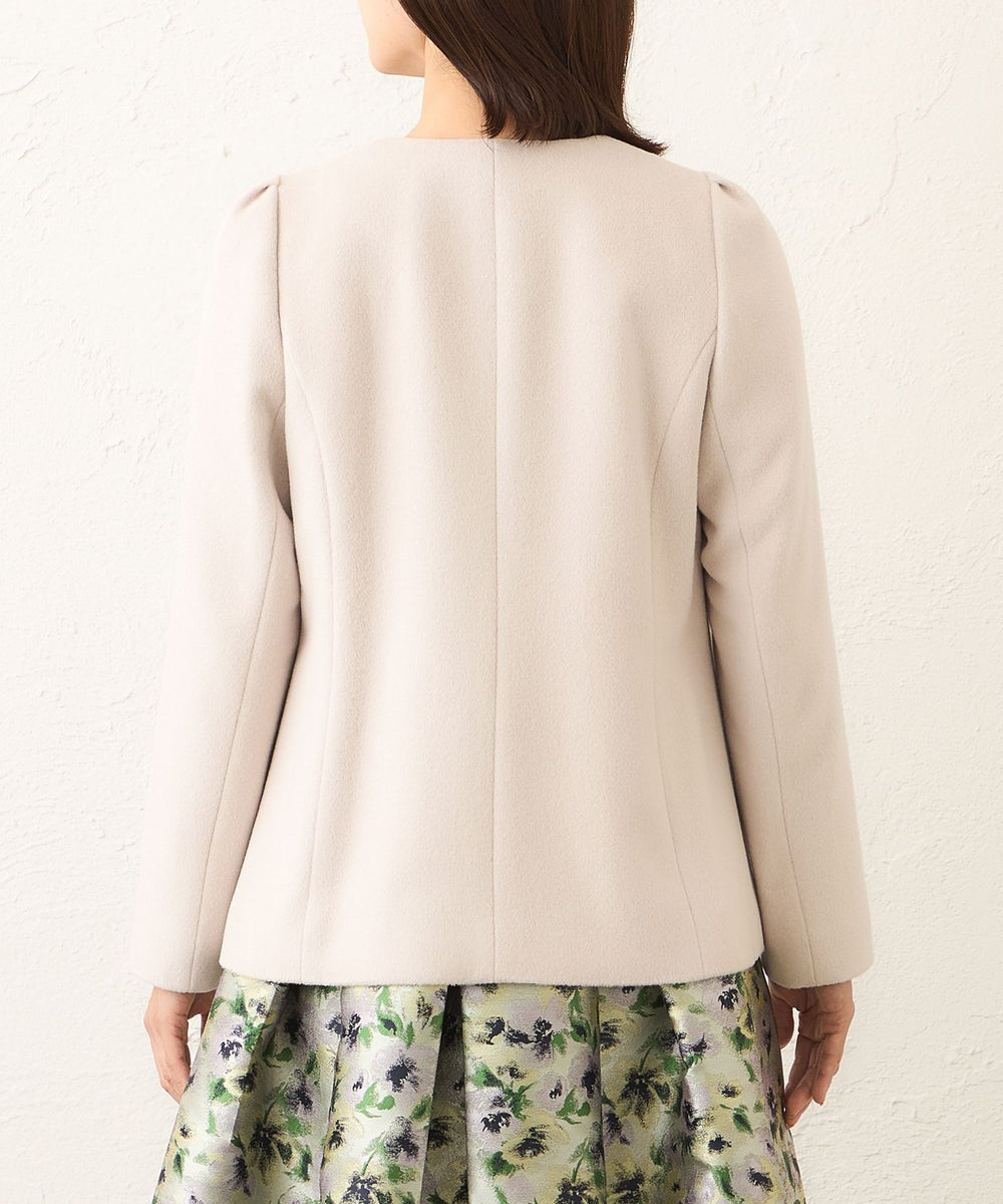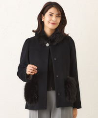 、汎用性の高いショートコートです。毛足の長い差し毛が入った豪華なフェイクファーポケットを取り外し可能で付け、スタイリングやシーンに合わせて印象を変えることができます。第一飾りボタンには、パールとラインストーンを組み合わせたブローチをあしらい、華やかなアクセントをプラス。他のアイテムにもブローチとして着用可能です。裏地にはドットジャカードのカラー裏地を使用し、見えない部分にもこだわりを感じさせる仕上がりです。
