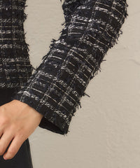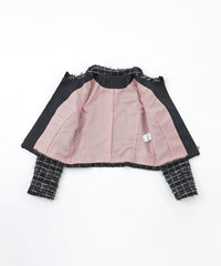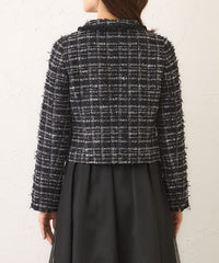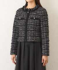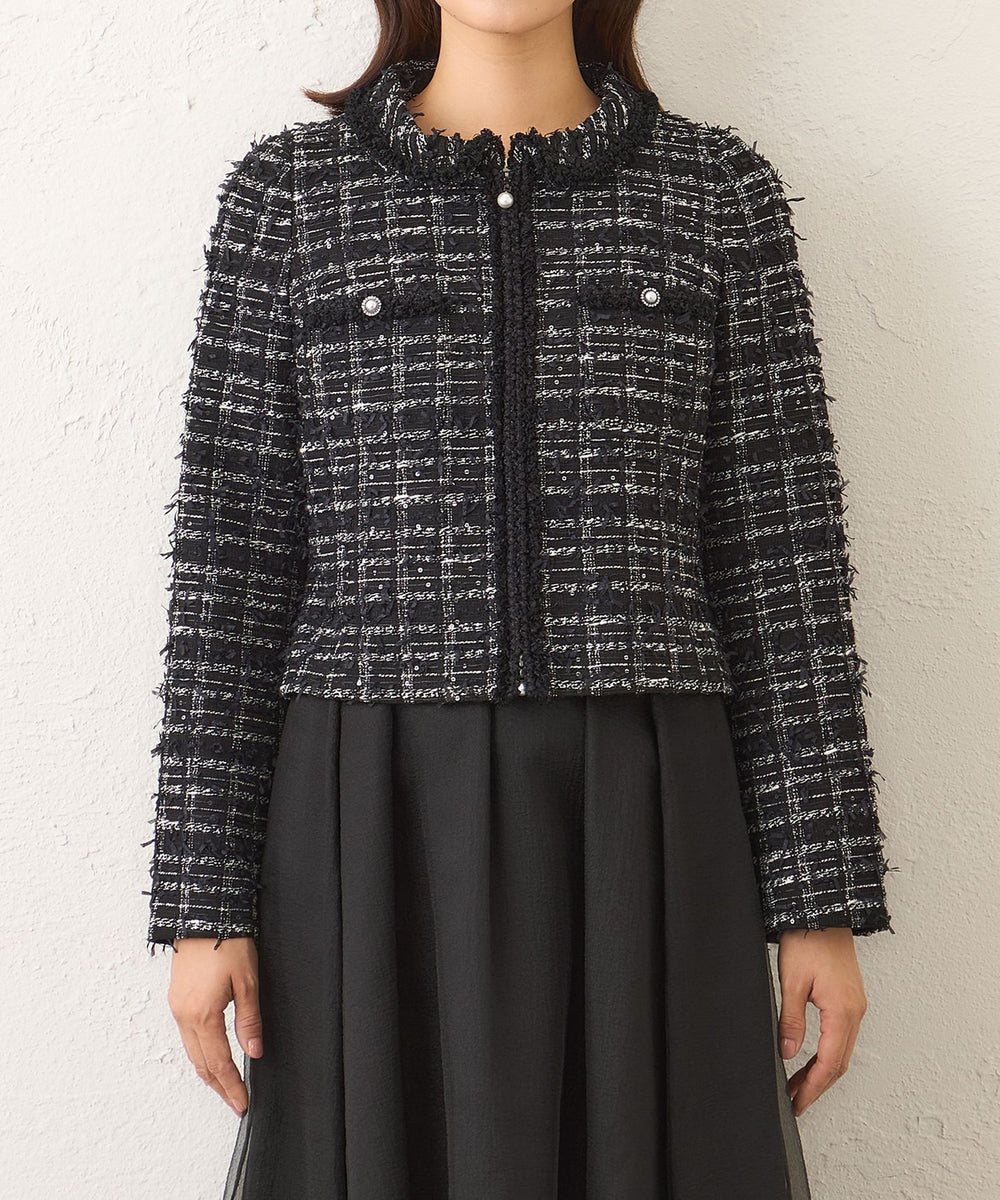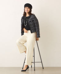 甘めのステンカラーに、センターフロントには上下スライダー付きの逆開ファスナーを採用したデザイン。襟周り・前端・ポケット口にブレードを施し、上品なアクセントを加えたコンパクトジャケットです。ボリュームスカートやワイドパンツとも好相性で、エレガントなスタイリングを楽しめます。
