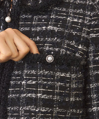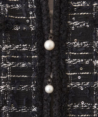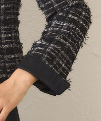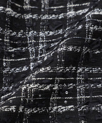 尾州産地で開発したオリジナルの先染めファンシー素材。多彩な意匠糸をタテ・ヨコに贅沢に用い、複雑なドビー組織で丁寧に織り上げました。黒地に映えるパピヨン糸やスパンコール糸などの立体的な表情が、高級感と存在感を引き立てます。