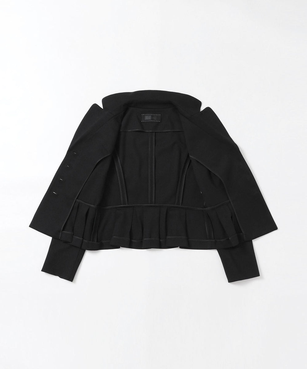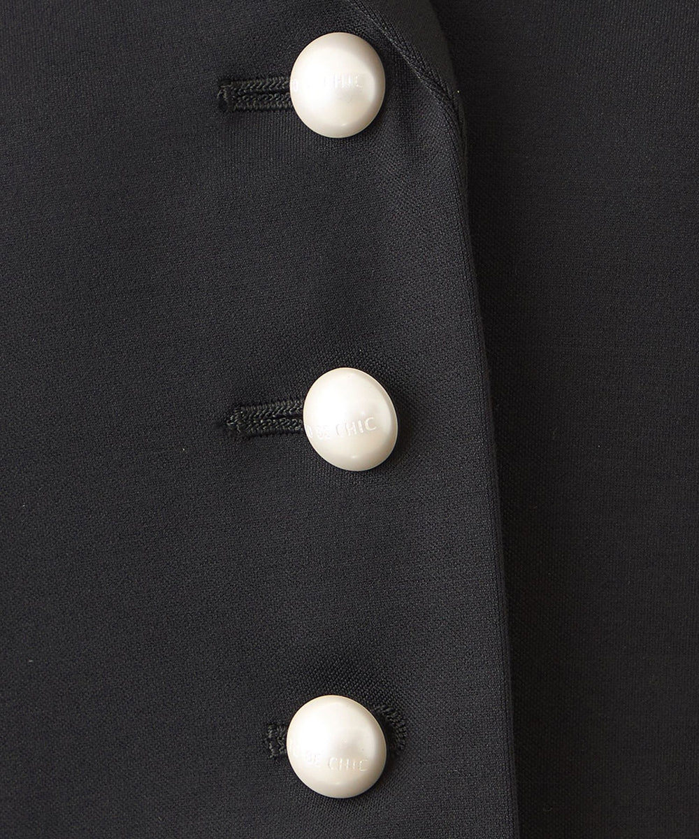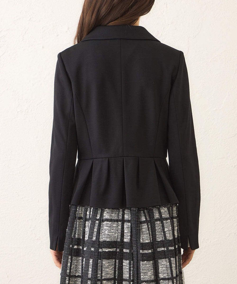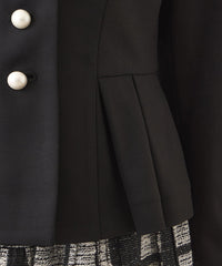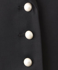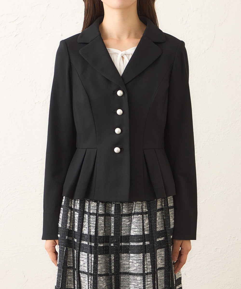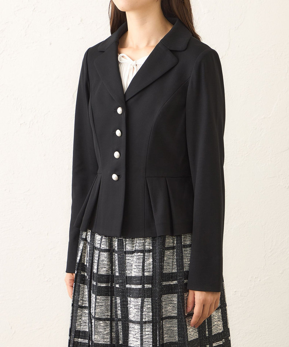 ・襟元は天巾を広めに取り、柔らかなカーブを描くことで、優しい印象に仕上げました。ウエストラインには脇側のパネル切り替えとタックを施し、腰回りを自然にカバー。すっきりとしたシルエットを演出しながら、エレガントな雰囲気を引き立てます。さらに、パール調のボタンが上品なアクセントとなっています。同じ素材のスカートとセットアップでの着用も可能。汎用性の高い一着です。
