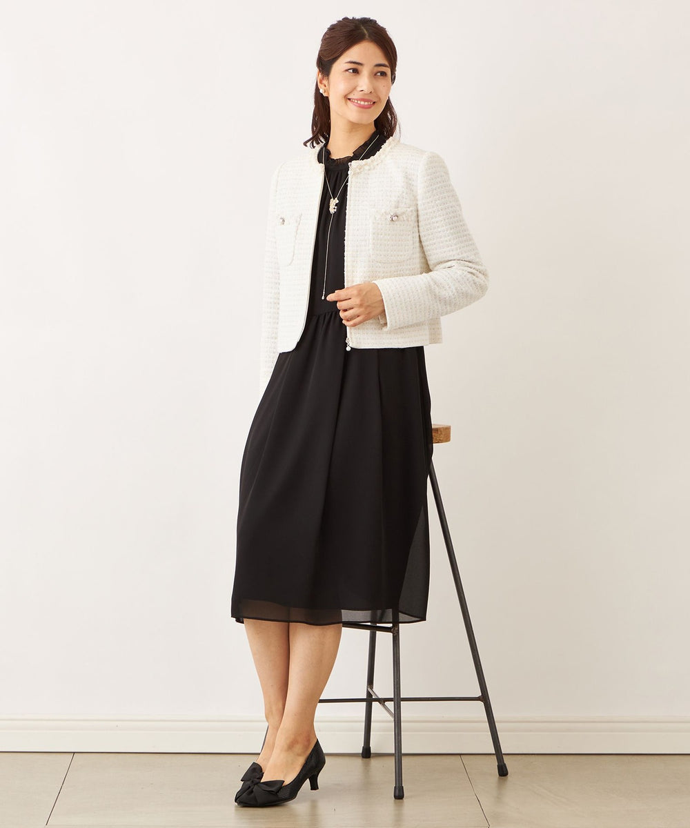 ノーカラーのコンパクトジャケット。ジャージー素材ならではのストレッチ性により、コンパクトなシルエットでも快適な着心地と細見え効果を両立しています。前開きは逆開ファスナー仕様で、裾側からも開閉可能。襟周りとポケット口には、オリジナルブレードをあしらい、さりげない華やかさをプラス。秋口に重宝する一着です。