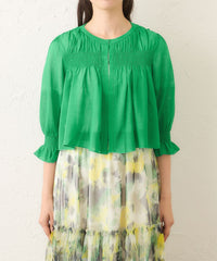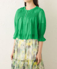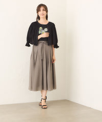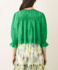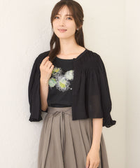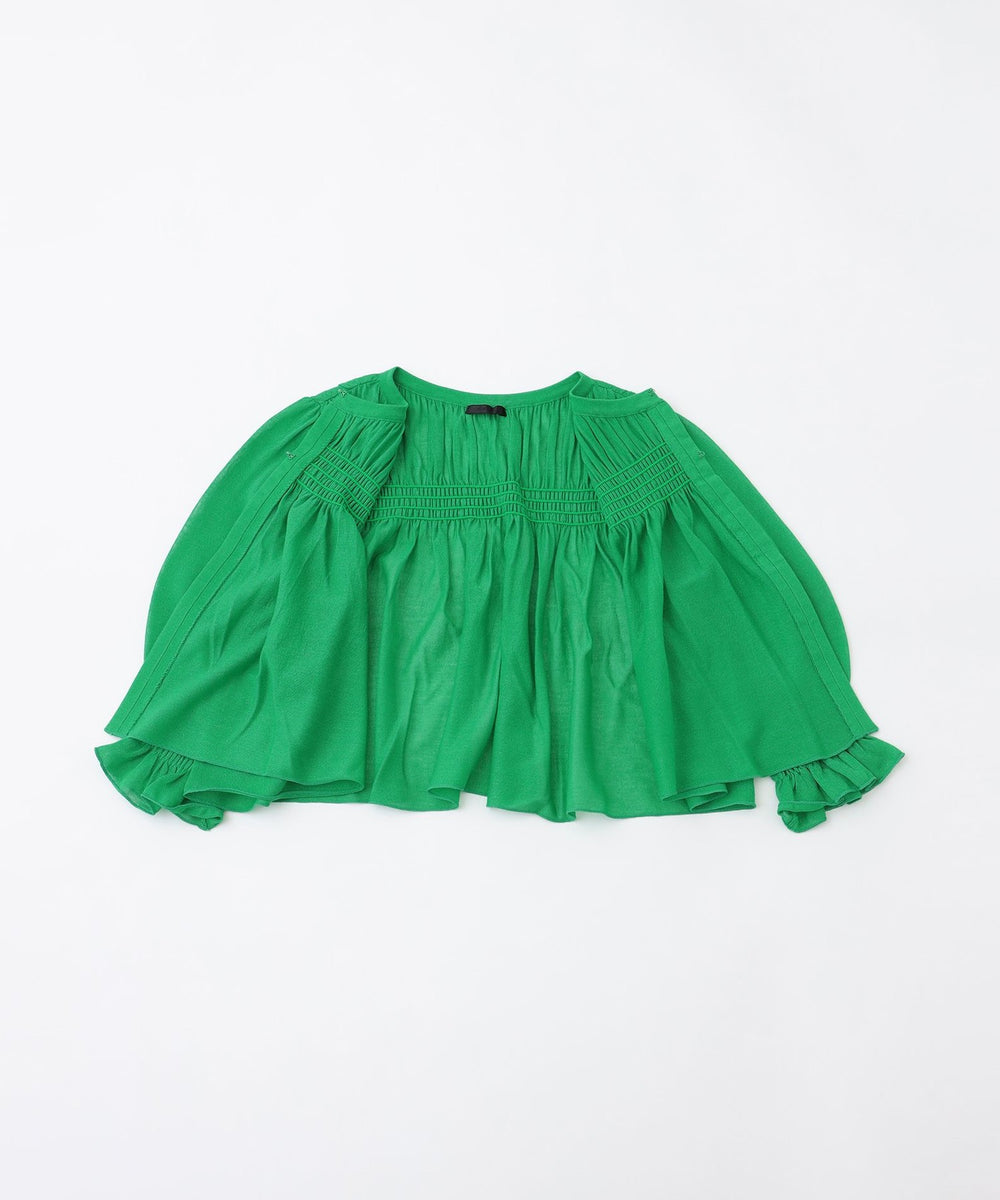 袖・胸元・背中にストレッチ糸を裏側に編み込むことで、シャーリング風の凝ったディテールに仕上げました。軽やかで清涼感があり、コンパクトなサイズ感でコーディネートしやすいショートボレロです。
