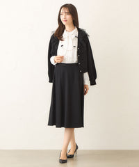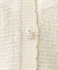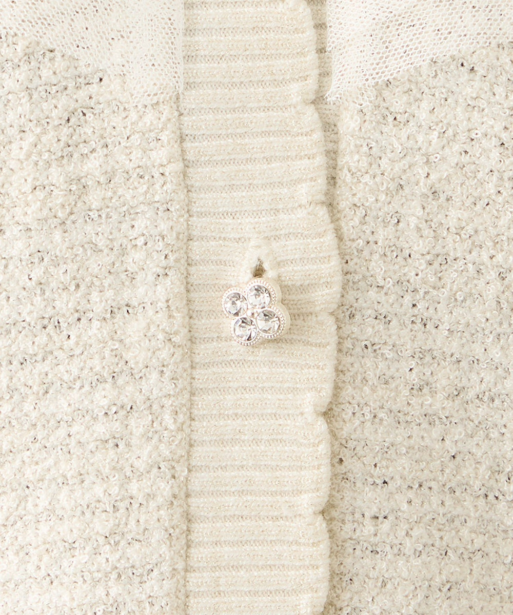 身頃には、レーヨン・ナイロン・ポリエステルのストレート糸、極細ラメ糸、アクリル・ナイロンのブークレ糸という3種類の糸をミックスし、ツイード調に編み上げた素材を使用。細番手の糸による軽やかさと程よい薄さに加え、奥行きのある豊かな表情が魅力です。襟部分には、ポリエステル100%のチュール生地を採用。ソフトな肌触りとしなやかな柔軟性で、上品な印象を演出します。