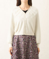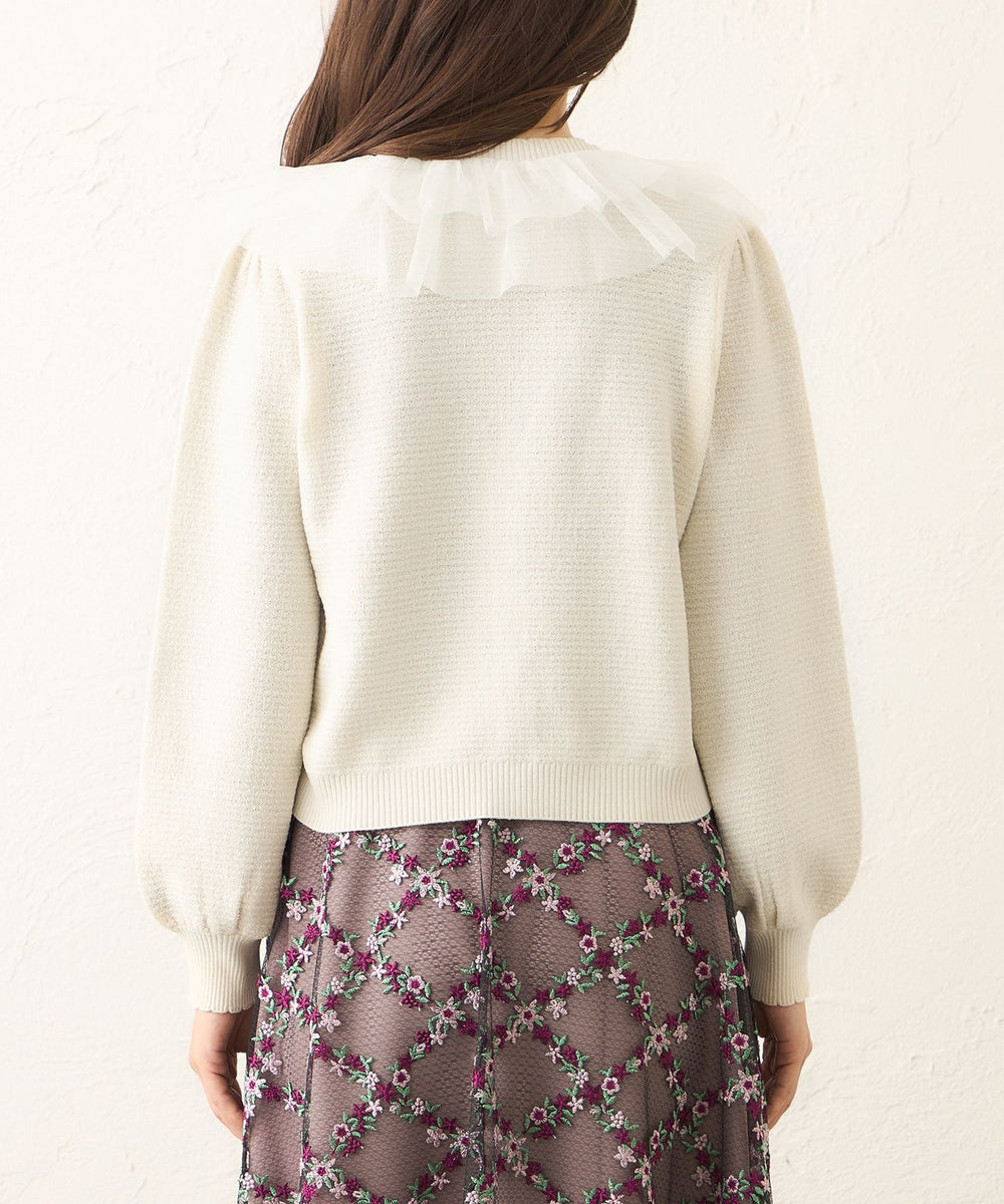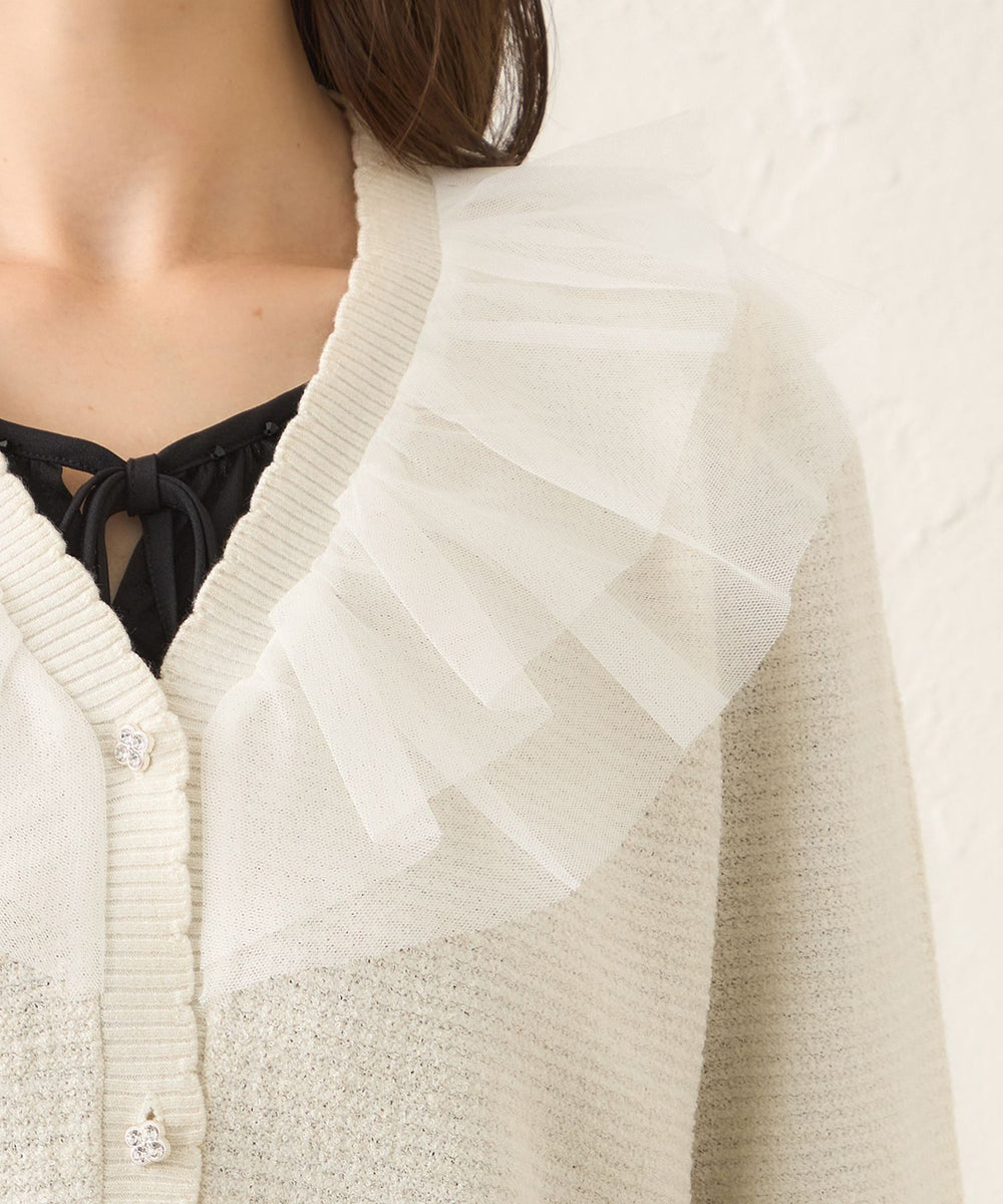 チュール素材のケープカラーに、表情豊かなツイード編地を組み合わせた、甘さと辛さが絶妙にミックスされたデザインニットカーディガンです。チュールと、程よくカジュアルなツイード調のニットのコントラストが、スタイリングに奥行きを与える一枚です。