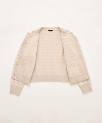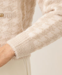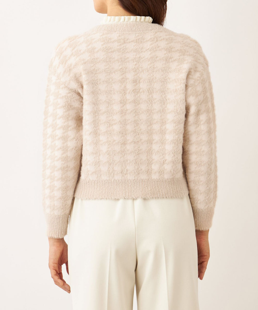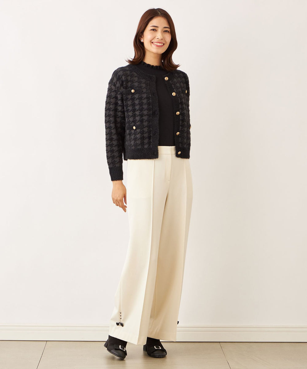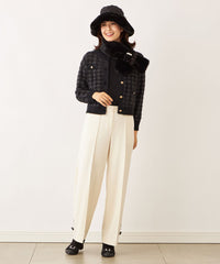 フェザーモールに同色のジャカード編みを組み合わせ、金ボタンをアクセントに加えることで、甘すぎず、TO BE CHICらしいエレガンスカジュアルなニット羽織りに仕上げました。着丈はやや短めで、スカートやチュニック丈のインナーとの相性も良く、パンツスタイルにもおすすめの一着です。