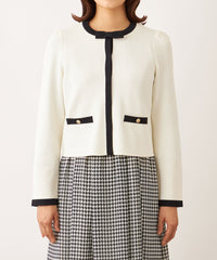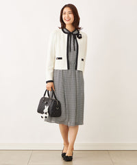 無地配色使いのクルーネックショート丈ニット羽織り。襟元には、無地タイプ限定でリボンコサージュが付属しており、さりげない華やかさを添えています。