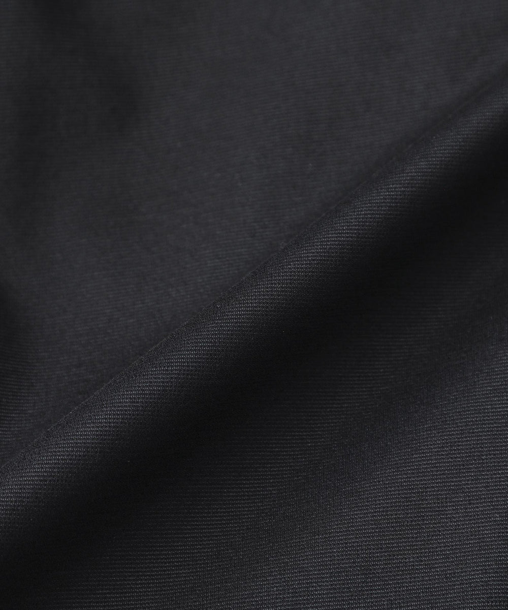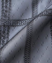 カット生地はハイゲージで丁寧に編み立てられており、まるで織物のようにきめ細やかな表情が魅力。捲縮エステルの使用により、ニットならではの心地よい伸縮性を持たせています。さらに、シルケット加工とガス焼き加工を施すことで、毛羽を極限まで抑え、上品な光沢と美しいドレープ感を引き出した、しなやかなファブリックに仕上げました。合わせたレースは、ラッセルレースでは珍しいチェック柄をモチーフにしたデザイン。編み物ならではの軽やかさと、織物のチェックでは表現できない繊細なフレア感が特徴です。