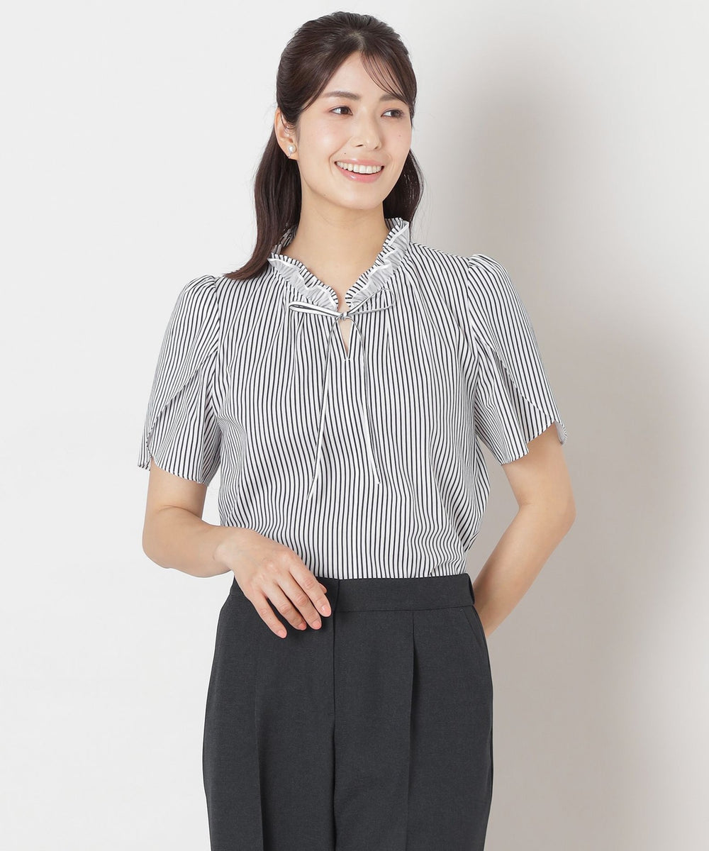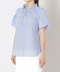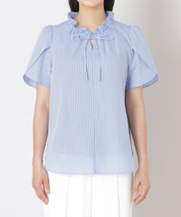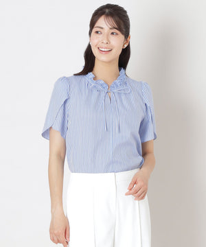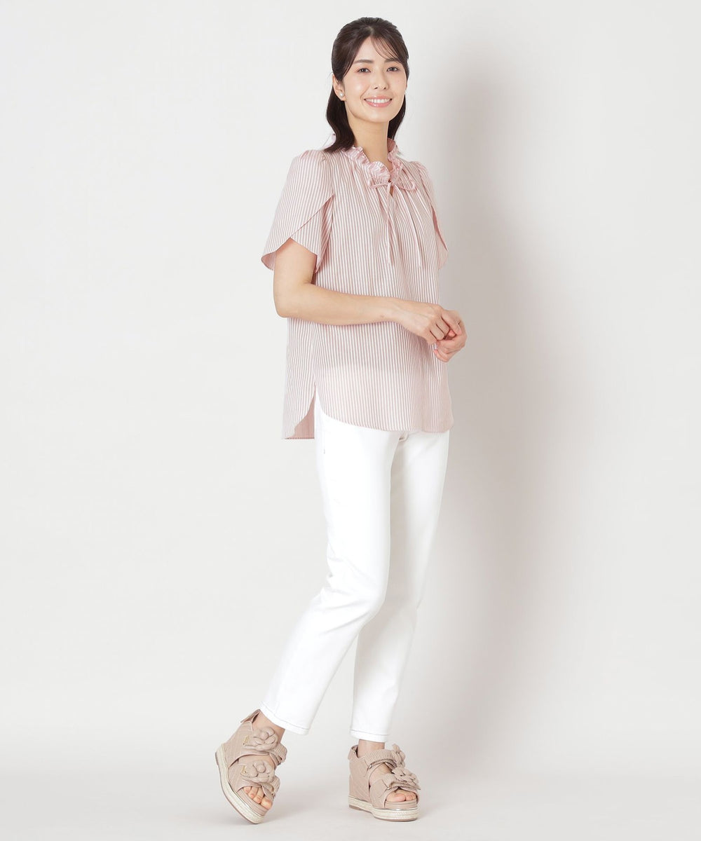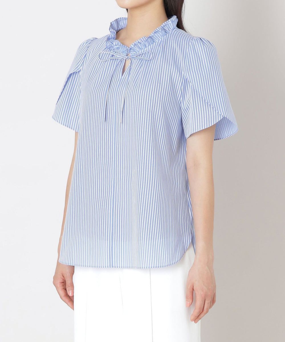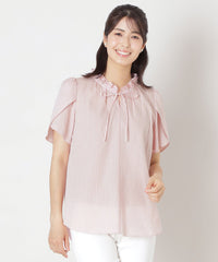 内側に共布、外側に透け感のある素材を重ねた二枚仕立ての立ちフリル衿に、共布の細リボンをあしらいました。袖はチューリップスリーブで、華やかさをプラスしています。スカート合わせはもちろん、パンツスタイルでもバランスよく着こなせる着丈で仕上げました。