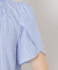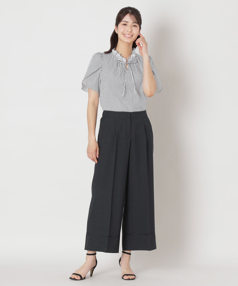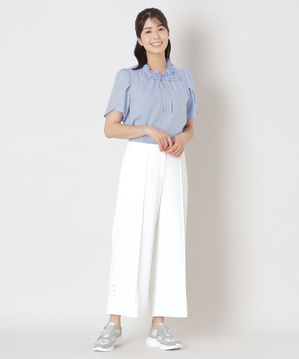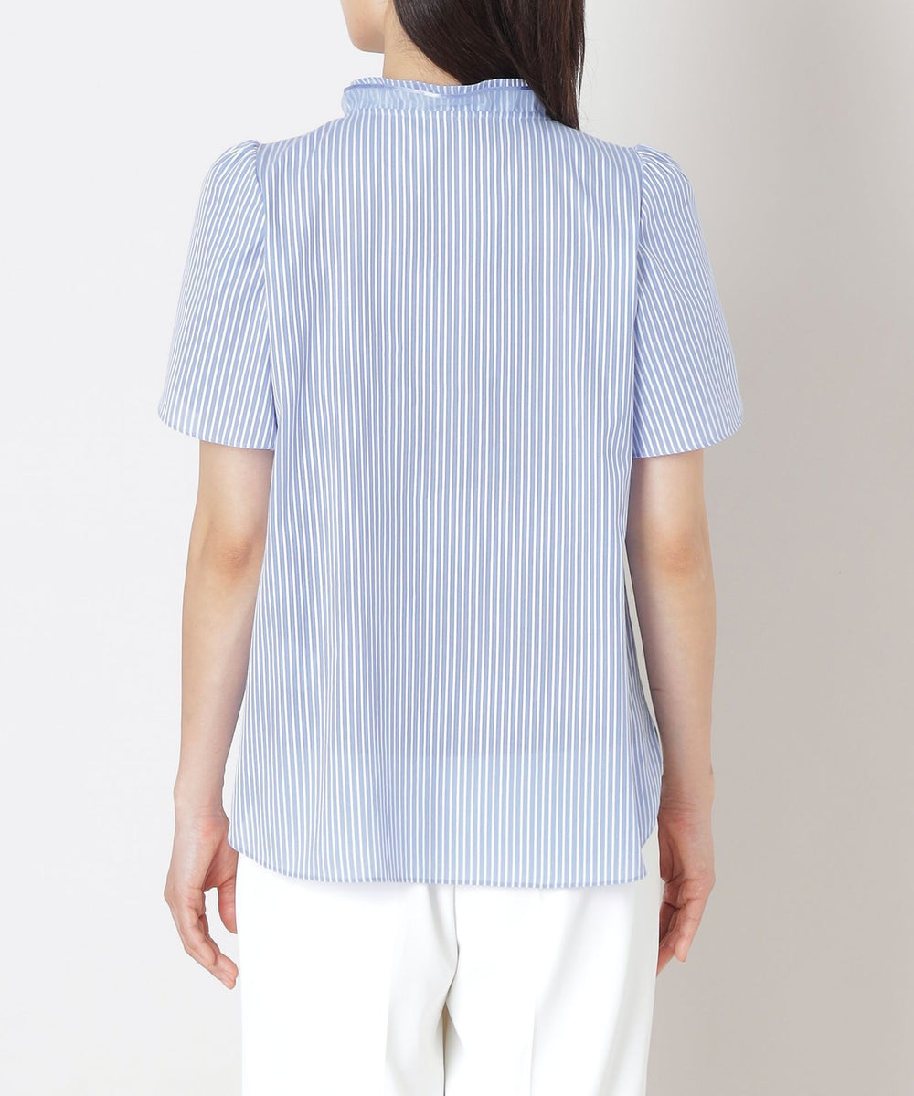 内側に共布、外側に透け感のある素材を重ねた二枚仕立ての立ちフリル衿に、共布の細リボンをあしらいました。袖はチューリップスリーブで、華やかさをプラスしています。スカート合わせはもちろん、パンツスタイルでもバランスよく着こなせる着丈で仕上げました。