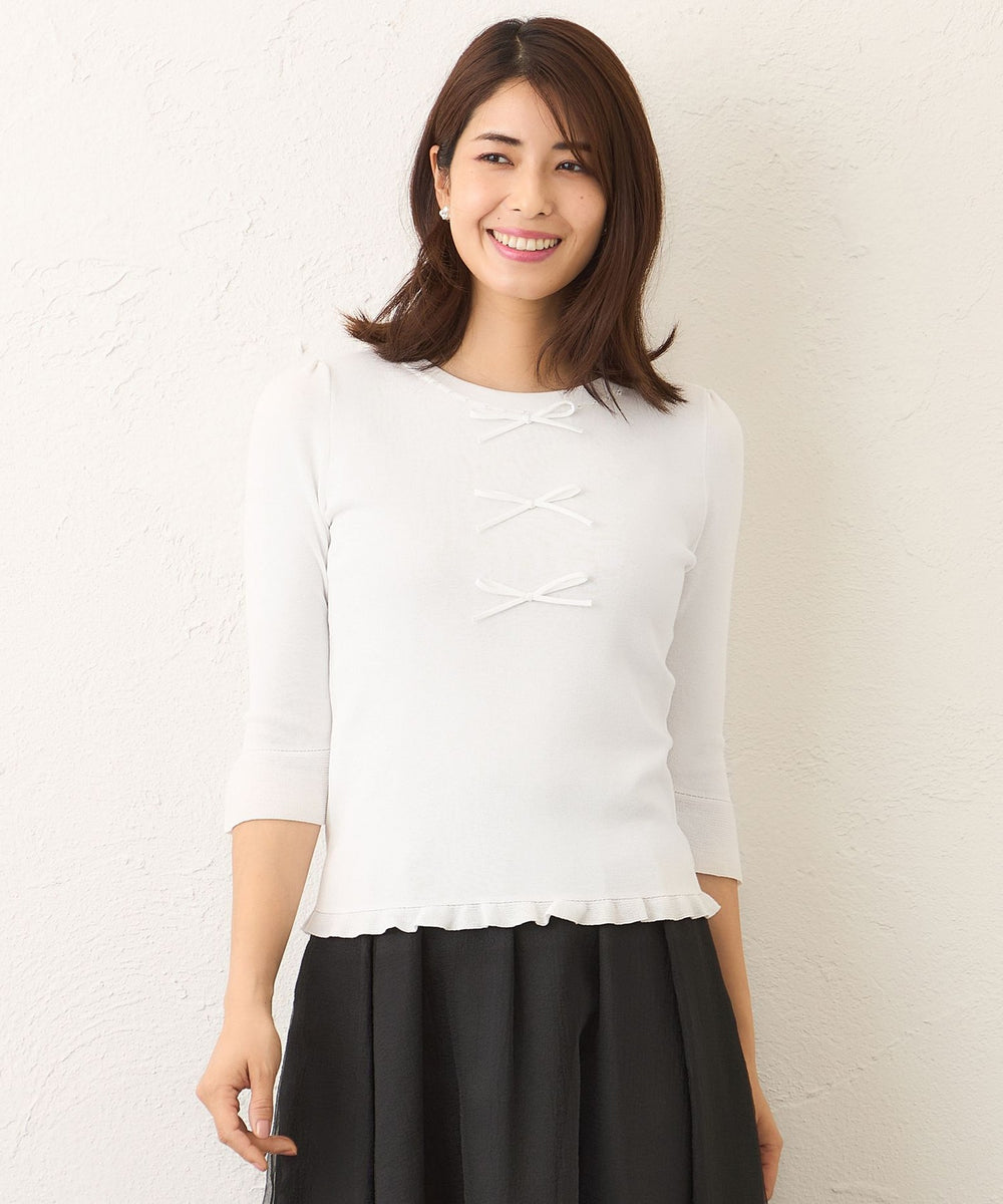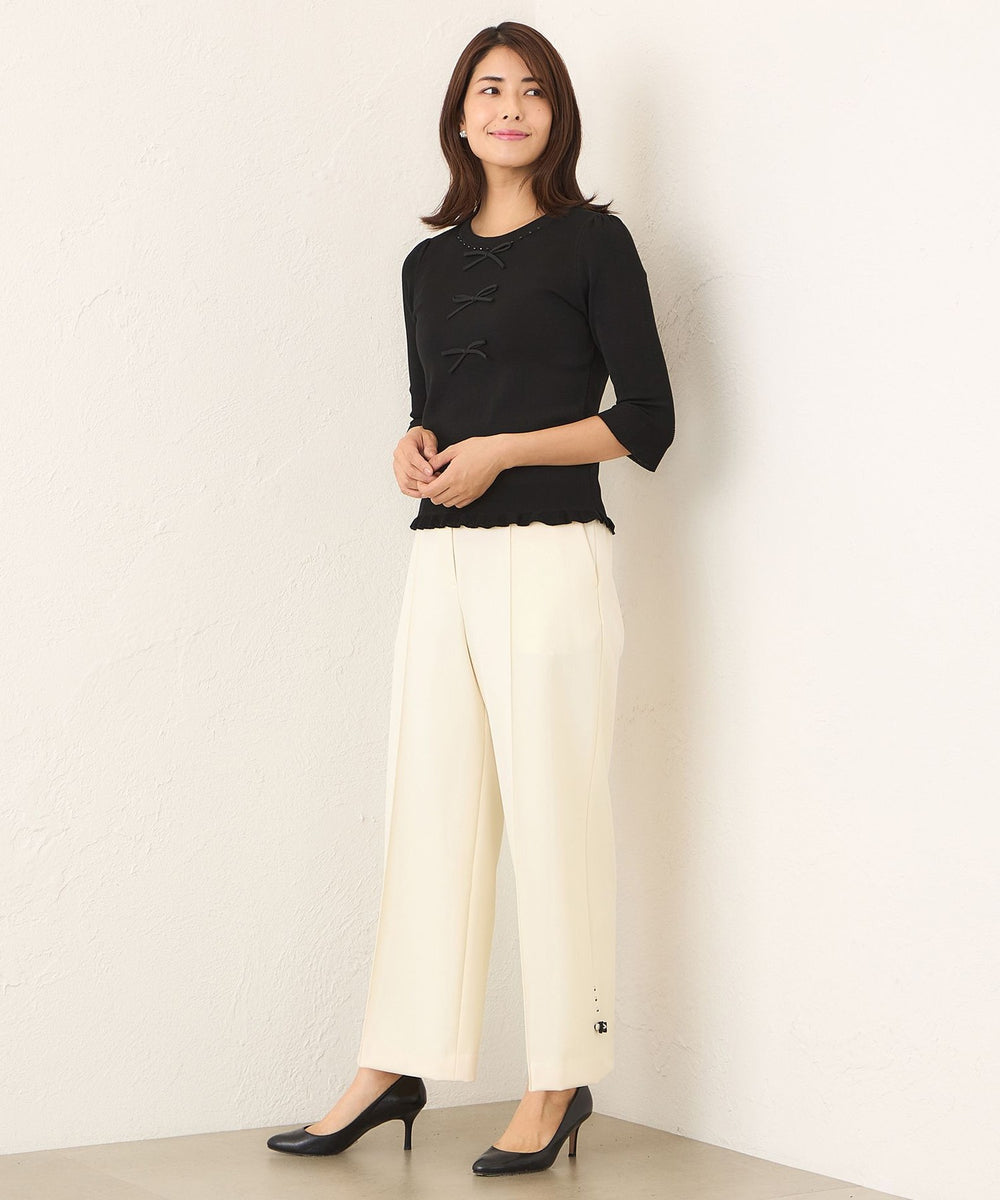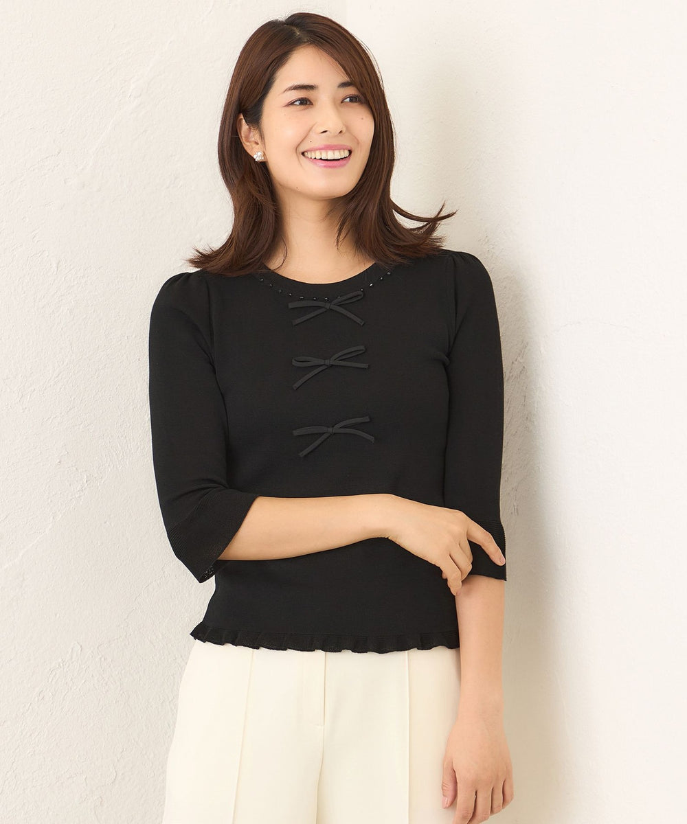 本体は肌触りが良く、さらっとした快適な着心地。襟元には上品な小ぶりのビジューを丁寧に刺繍し、細い別布のリボンをあしらうことで、甘さを抑えたエレガントな印象に仕上げたニットプルオーバーです。