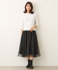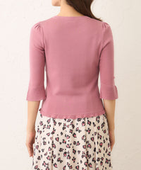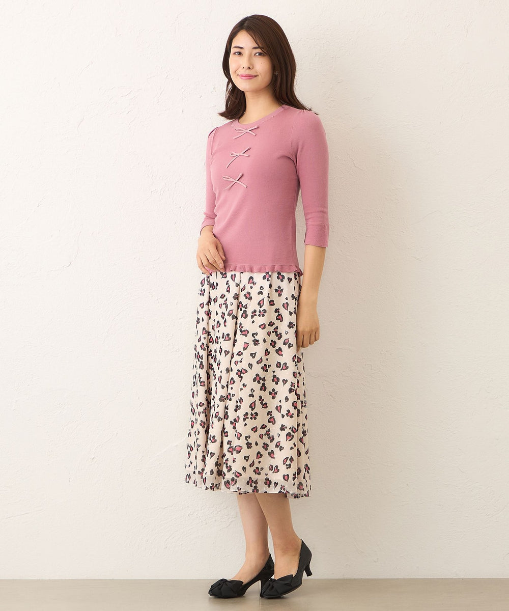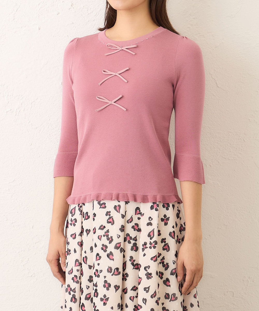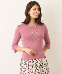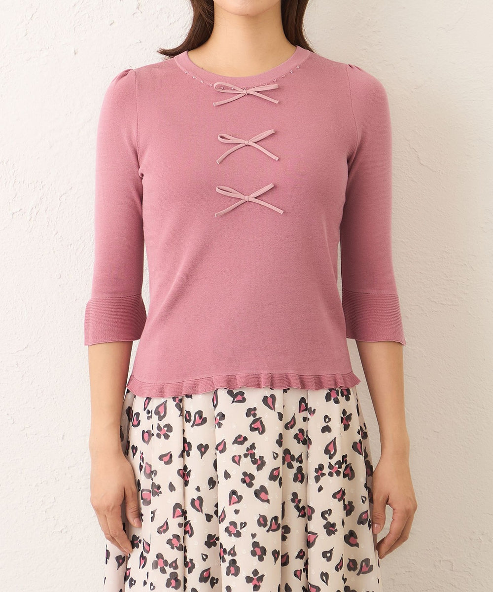 本体は肌触りが良く、さらっとした快適な着心地。襟元には上品な小ぶりのビジューを丁寧に刺繍し、細い別布のリボンをあしらうことで、甘さを抑えたエレガントな印象に仕上げたニットプルオーバーです。
