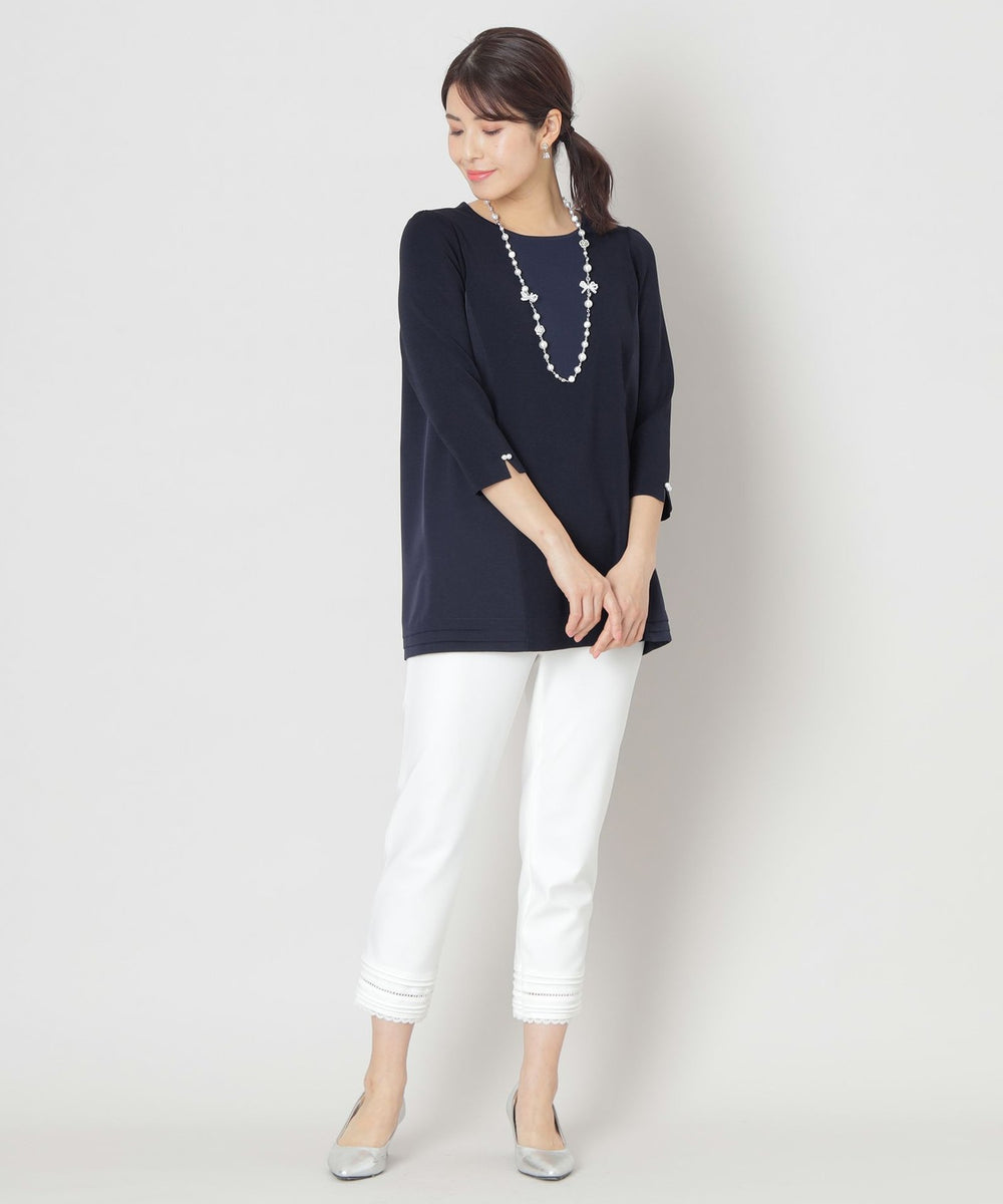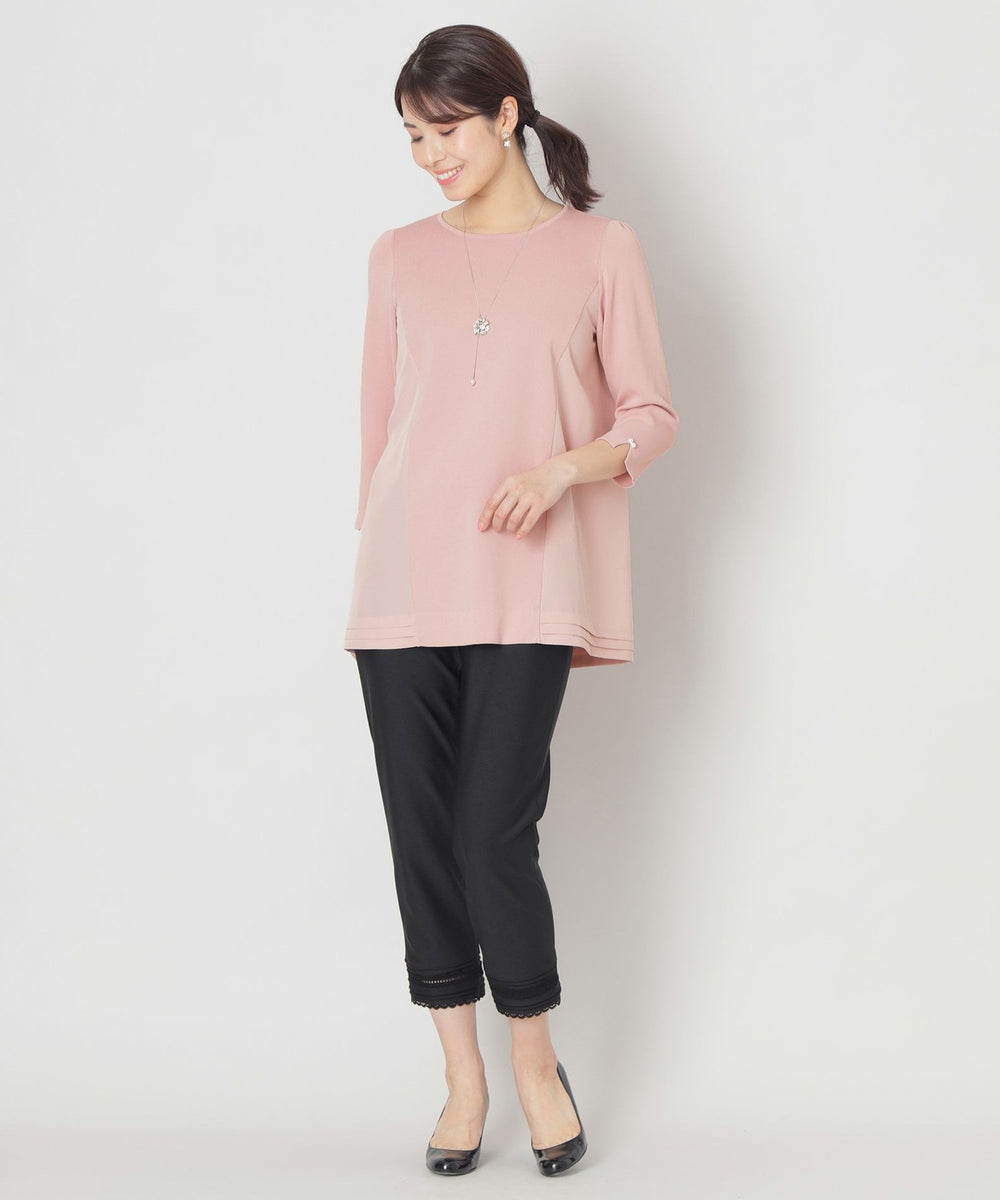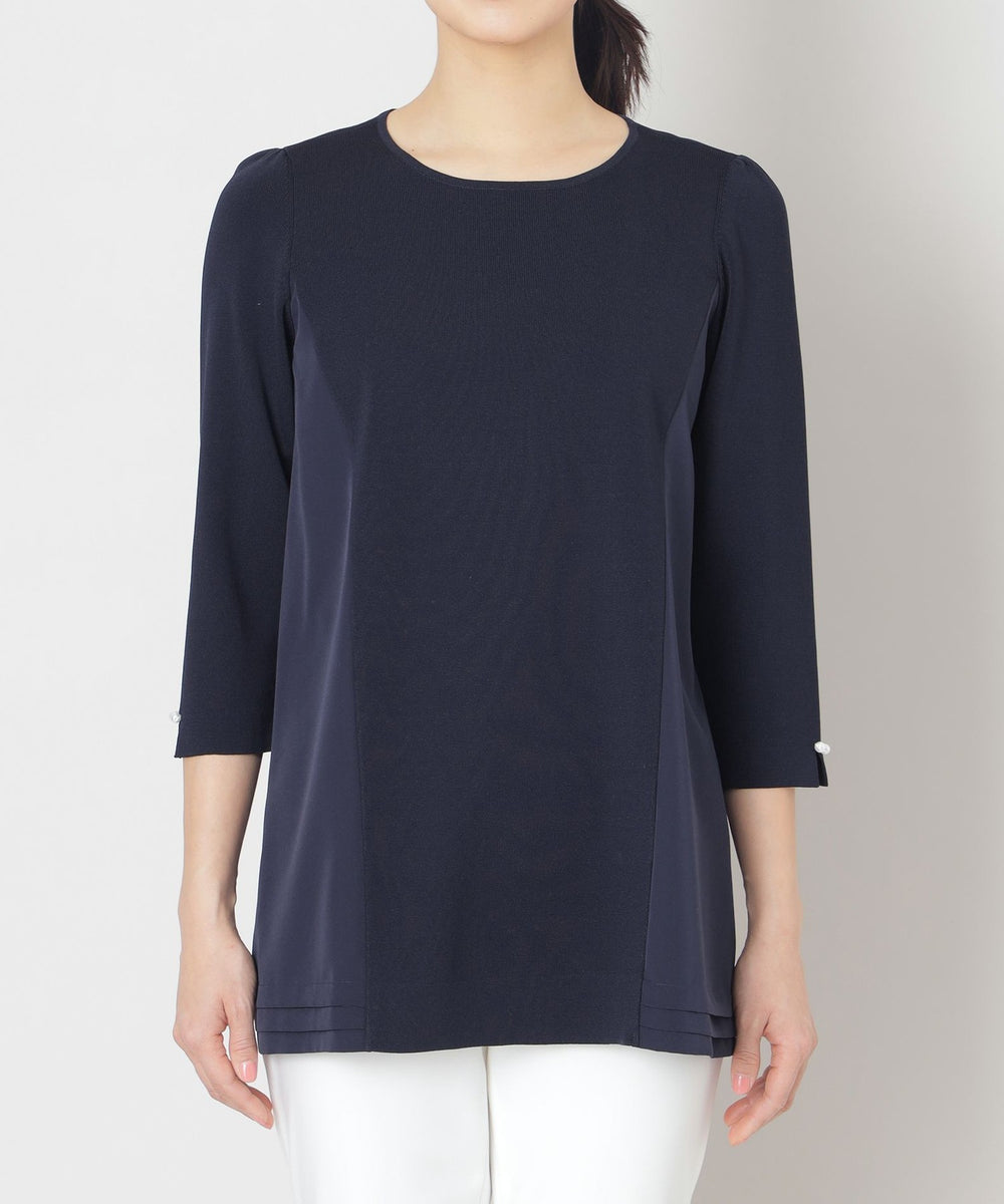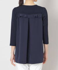前身頃をニット、後身頃に布帛を使ったドッキングチュニックです。ヨーク部分と裾部分にピンタックデザインを施し、フリルデザインをバックスタイルにアクセントをつけたデザインチュニックです。袖にはパールビジューをあしらったエレガンスなデザインのチュニックです。
