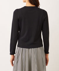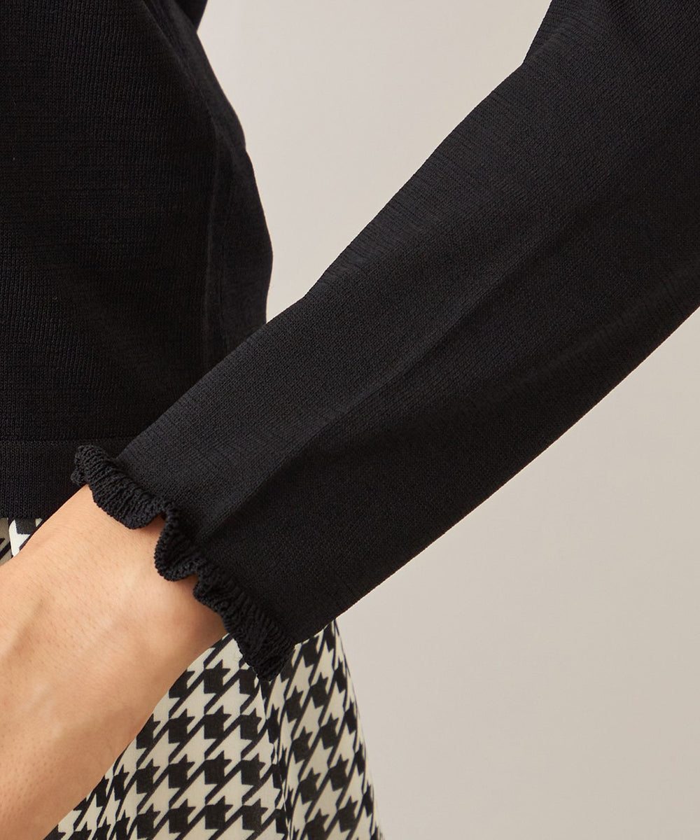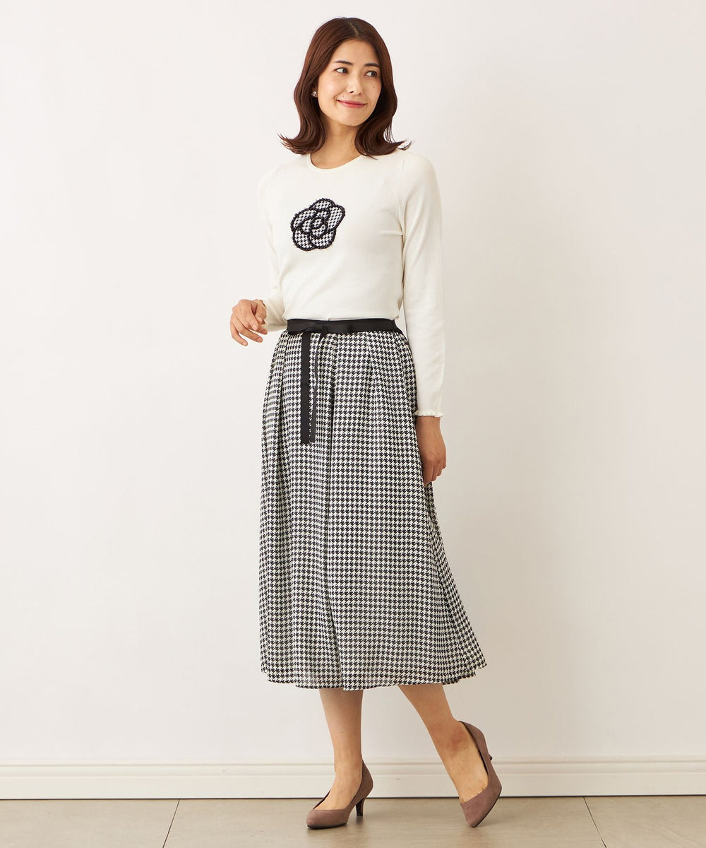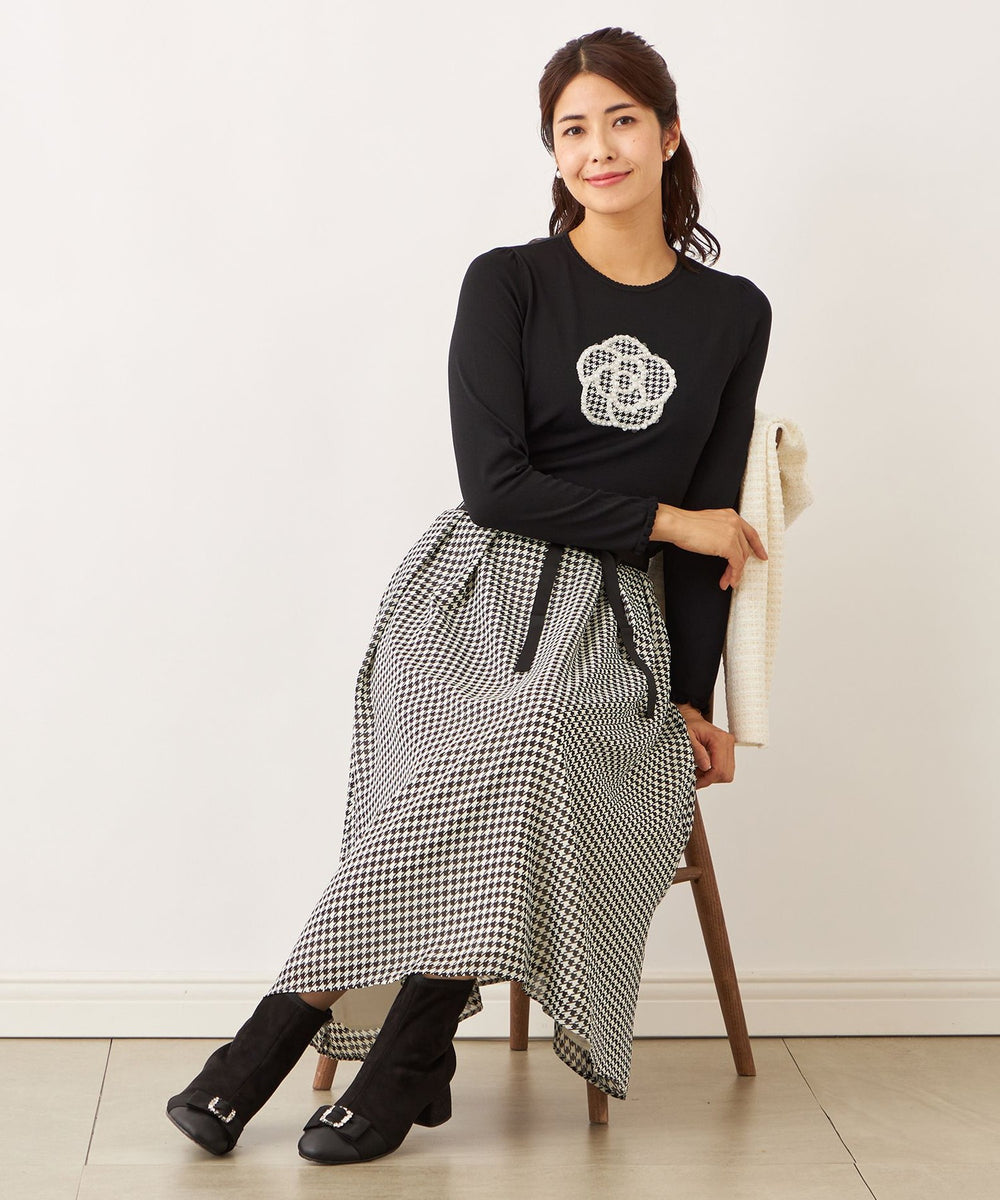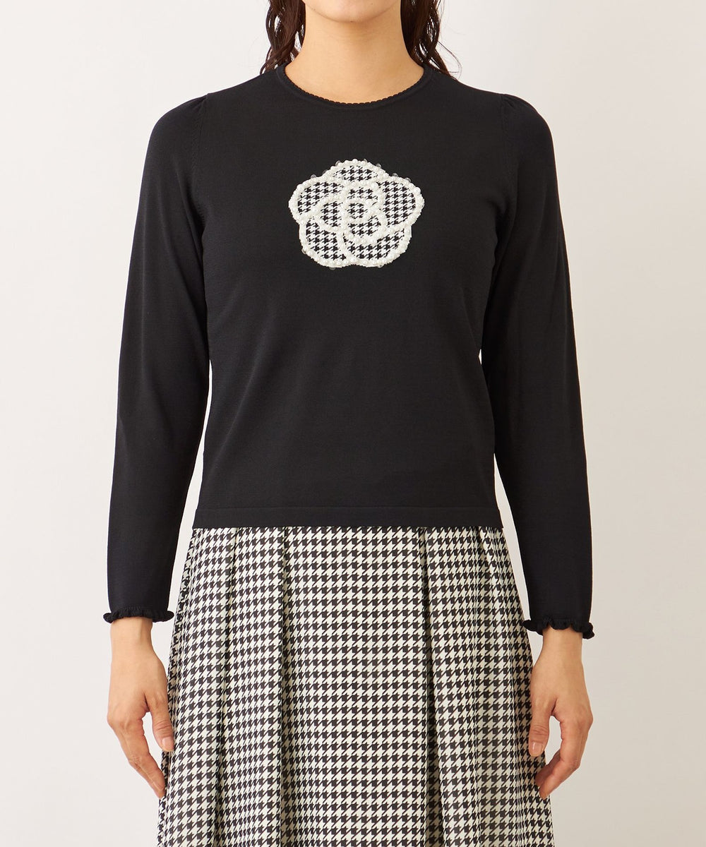 千鳥柄のカメリアモチーフをあしらったニットインナー。花の縁にはパールとスパンコールの刺繍を施し、花びら部分は千鳥柄をジャカード編みにすることで、華やかさと着やすさを両立したプルオーバーに仕上げています。