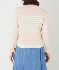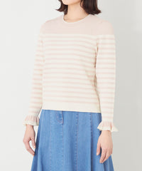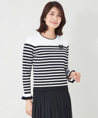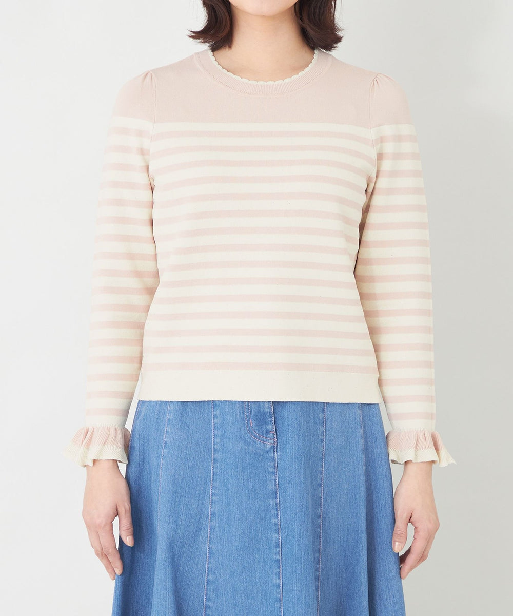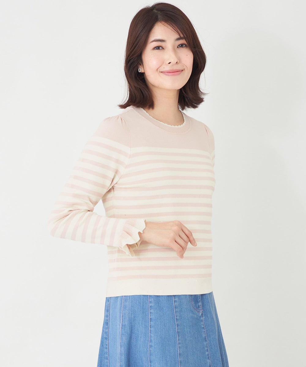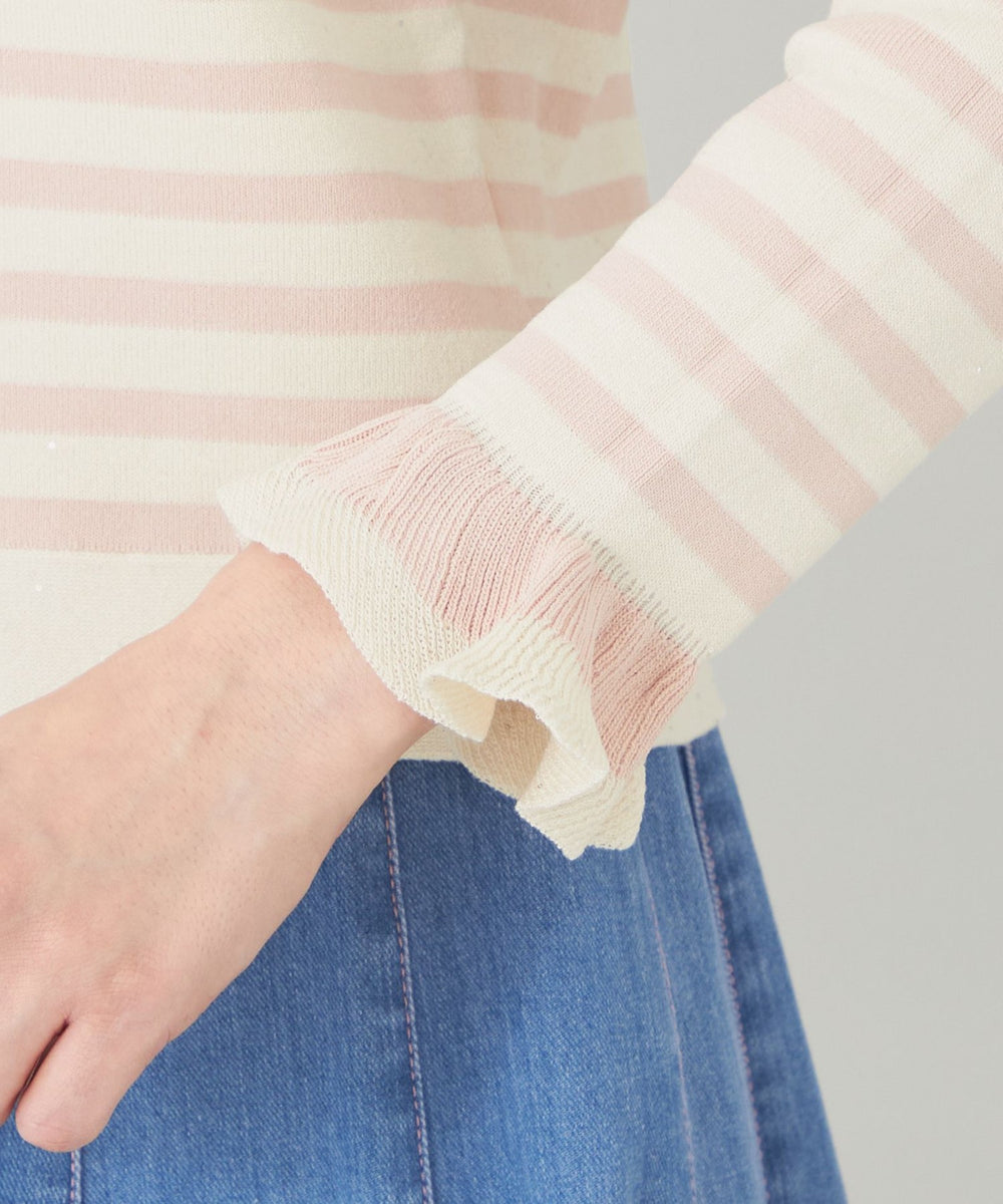 レーヨンナイロン糸に2mmスパンコール糸を組み合わせた総針編みで、エレガンスとカジュアル感を兼ね備えたボーダー柄に仕上げました。上品なきらめきがスタイリングのアクセントとなり、きれいめからデイリーまで幅広いコーディネートに活躍します。