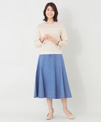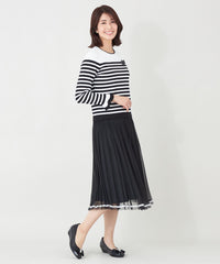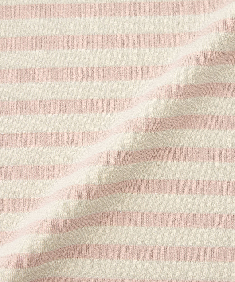 レーヨン×ナイロンのストレッチ素材を使用。素材本来の程よいキックバックがあり、快適な着心地を叶えます。強撚糸ならではの清涼感と、すっきりと美しい編み目が特徴です。TO BE CHIC定番の糸のみを使用した編地と、定番糸にスパンコール糸を引き揃えた編地を交互に配したボーダー編みで、さりげない表情感をプラスしています。
